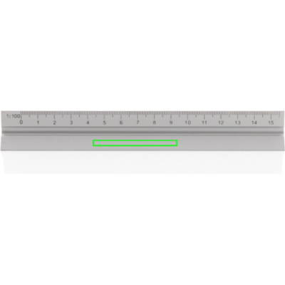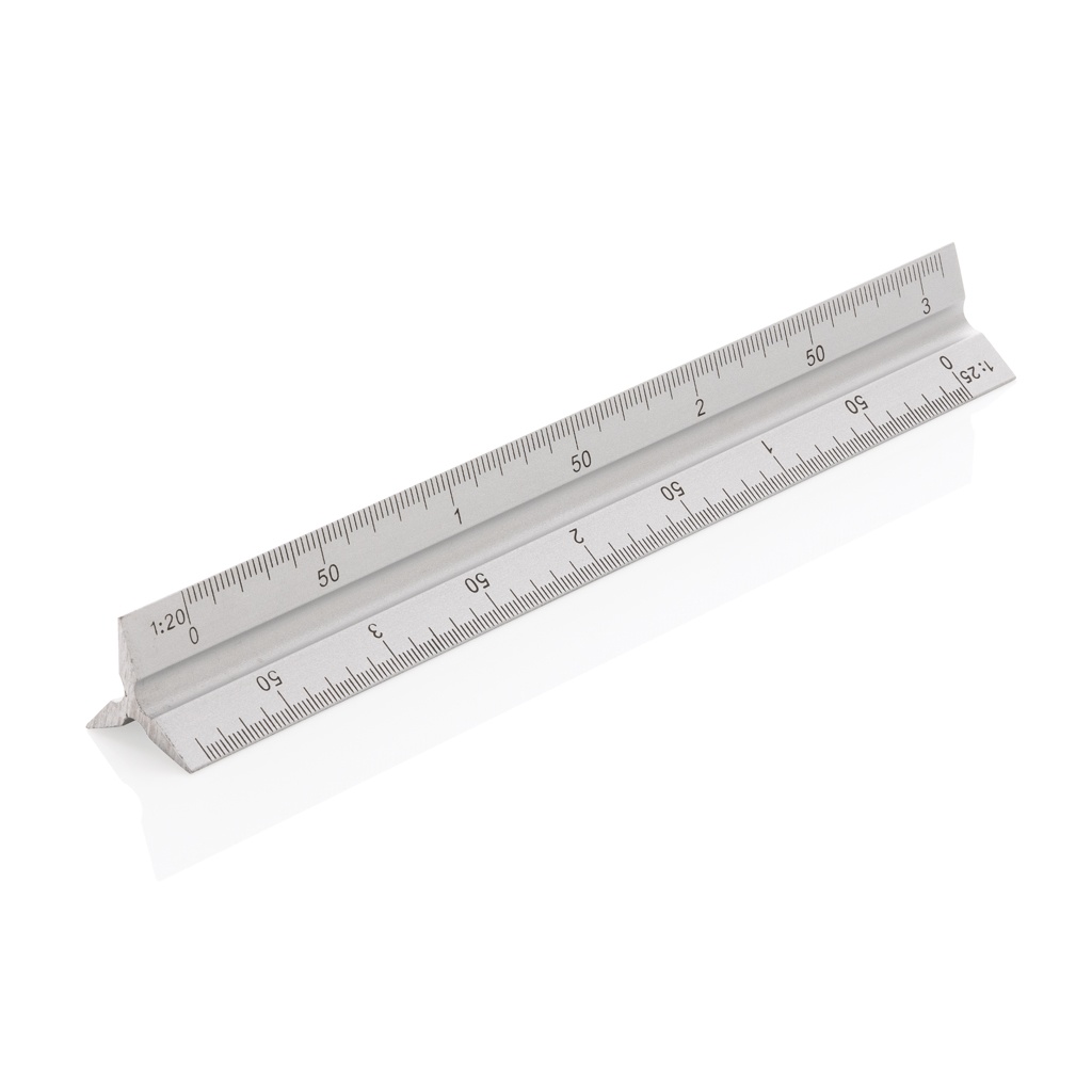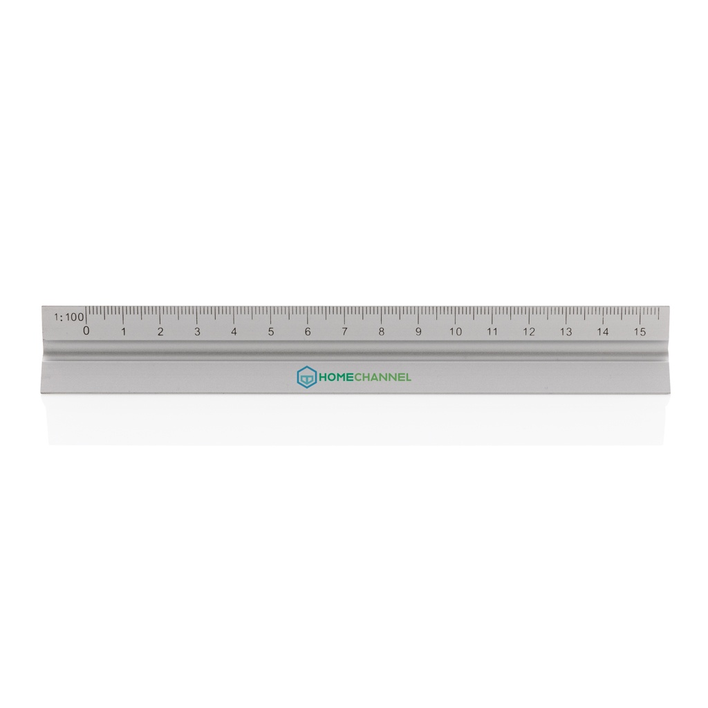 15cm Aluminiumlineal mit 5 verschiedenen Skalen (1:20, 1:25, 1:50, 1:75 und 1:100); 1 Seite ist für die Werbeanbringung vorgesehen.