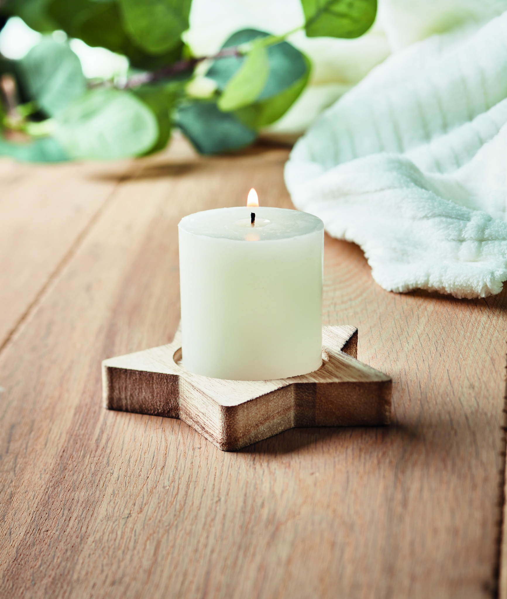 Sternförmiger Halter aus Pappelholz mit Kerze. Vanille-Duft.