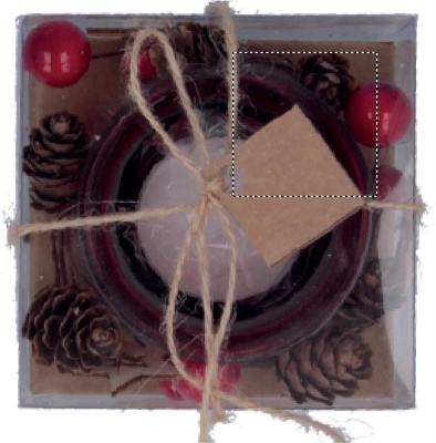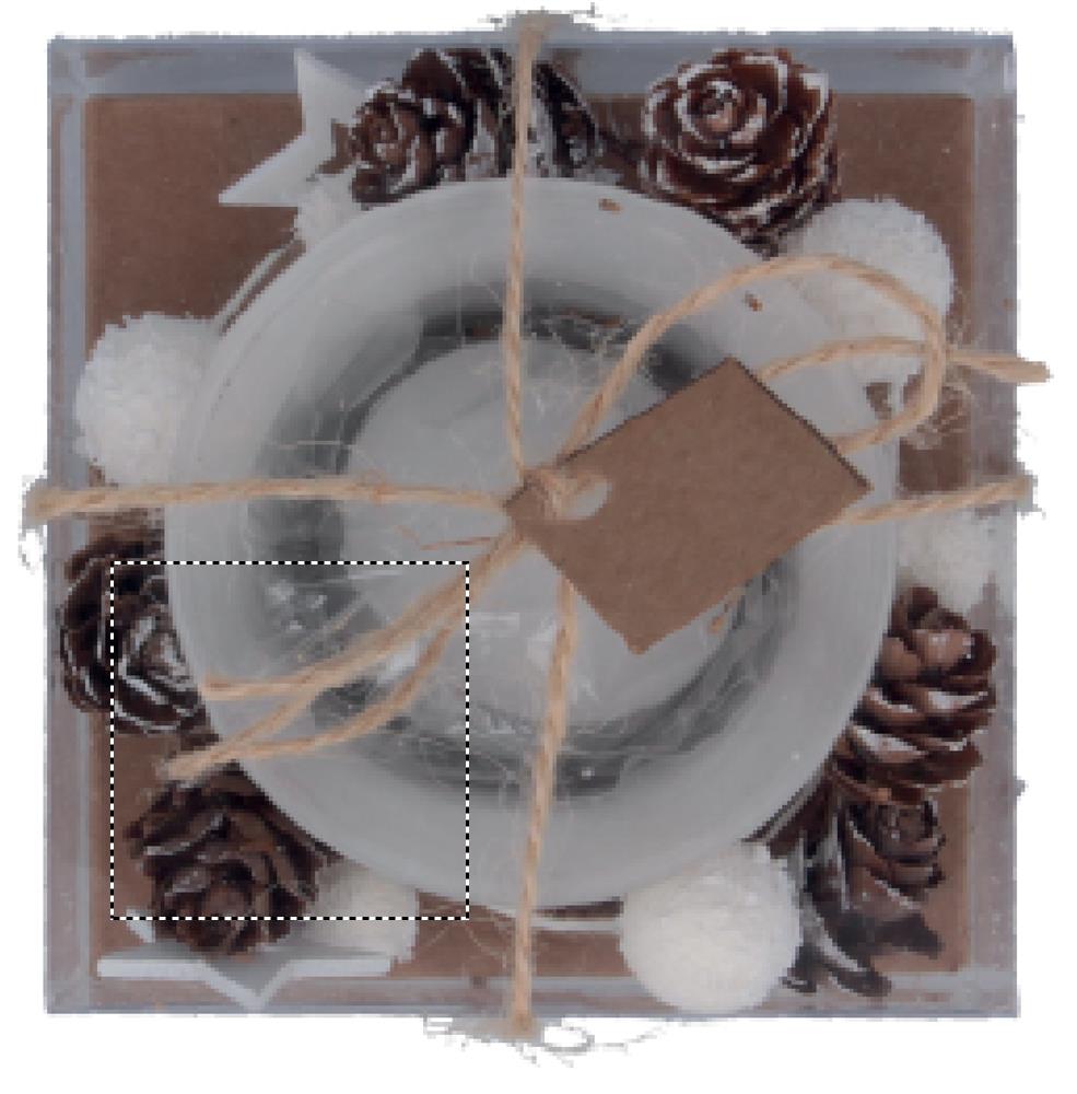 Kerzenhalter aus Glas mit weihnachtlicher Dekoration. Verpackt in einer PVC/Karton Box mit Band und Anhänger.