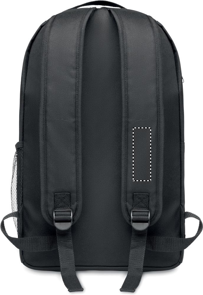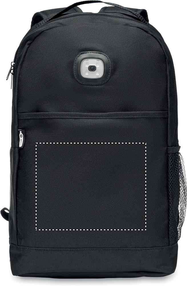 Rucksack aus 600D RPET mit abnehmbaren COB Licht auf der Vorderseite. Weißes COB Licht mit 3 unterschiedlichen Lichtstärken. Fronttasche mit Klettverschluss. Seitliche Netztasche. Inkl. Knopfzelle.