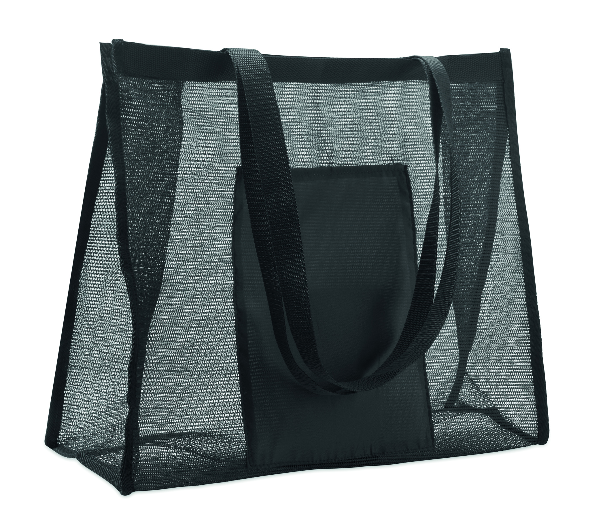 Einkaufstasche aus RPET-Mesh und 210D RPET. Kurze Tragegriffe. Große, offene Fronttasche. Volumen: 20L. Maximale Traglast: 10 kg.