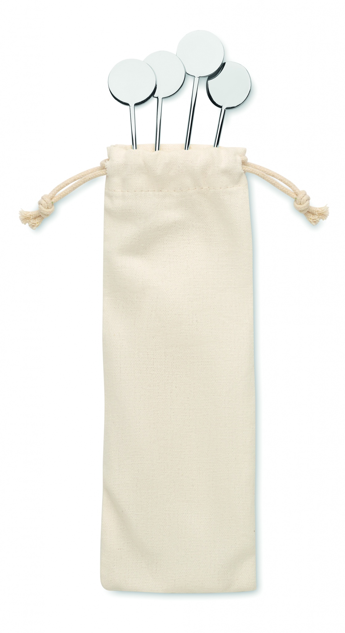Set mit 4 Rührstäbchen aus Edelstahl. Lieferung in einem Beutel aus Baumwolle mit Kordelzug.