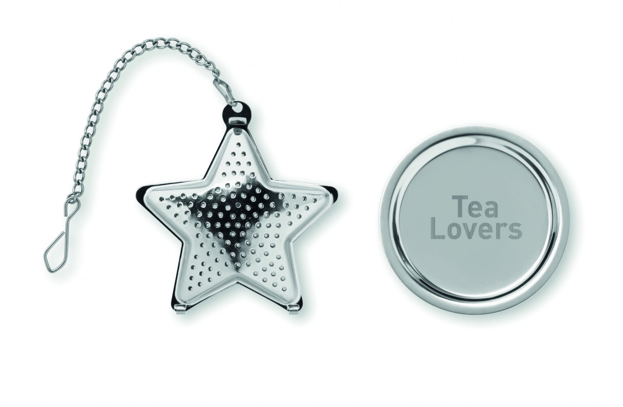 Tee-Ei/Teefilter aus Edelstahl mit kleinem Untersetzer.