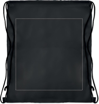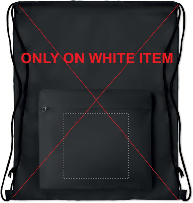 Large drawstring bag in 210D polyester with zippered front pocket.