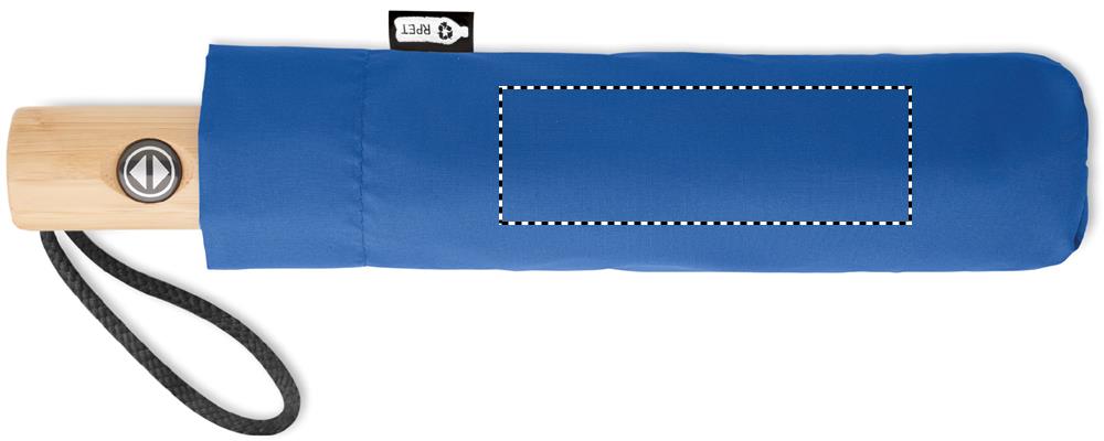 23 inch 3 fold auto open/close reversible umbrella in 190T pongee RPET. Fibre-glass ribs. Bamboo handle with cotton wrist strap. Includes matching RPET pouch. Bamboo is a natural product, there may be slight variations in colour and size per item, which can affect the final decoration outcome.