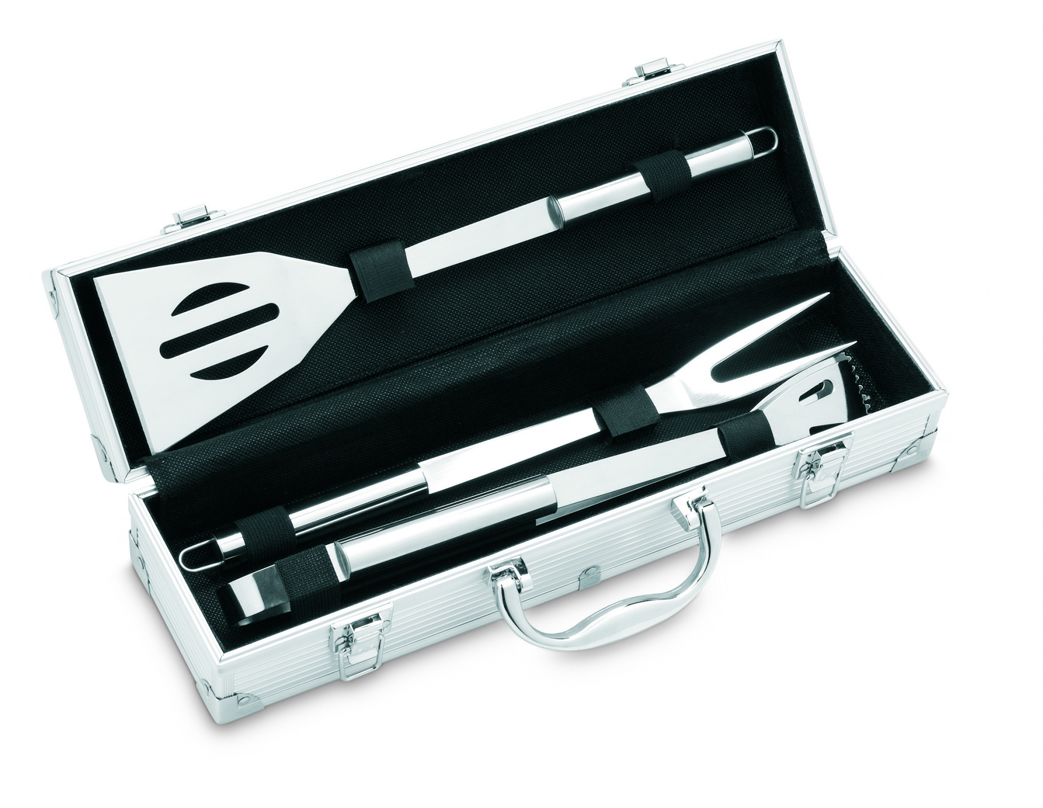 Aluminium suitcase includes 3 stainless steel BBQ tools. Plate for logo imprint.