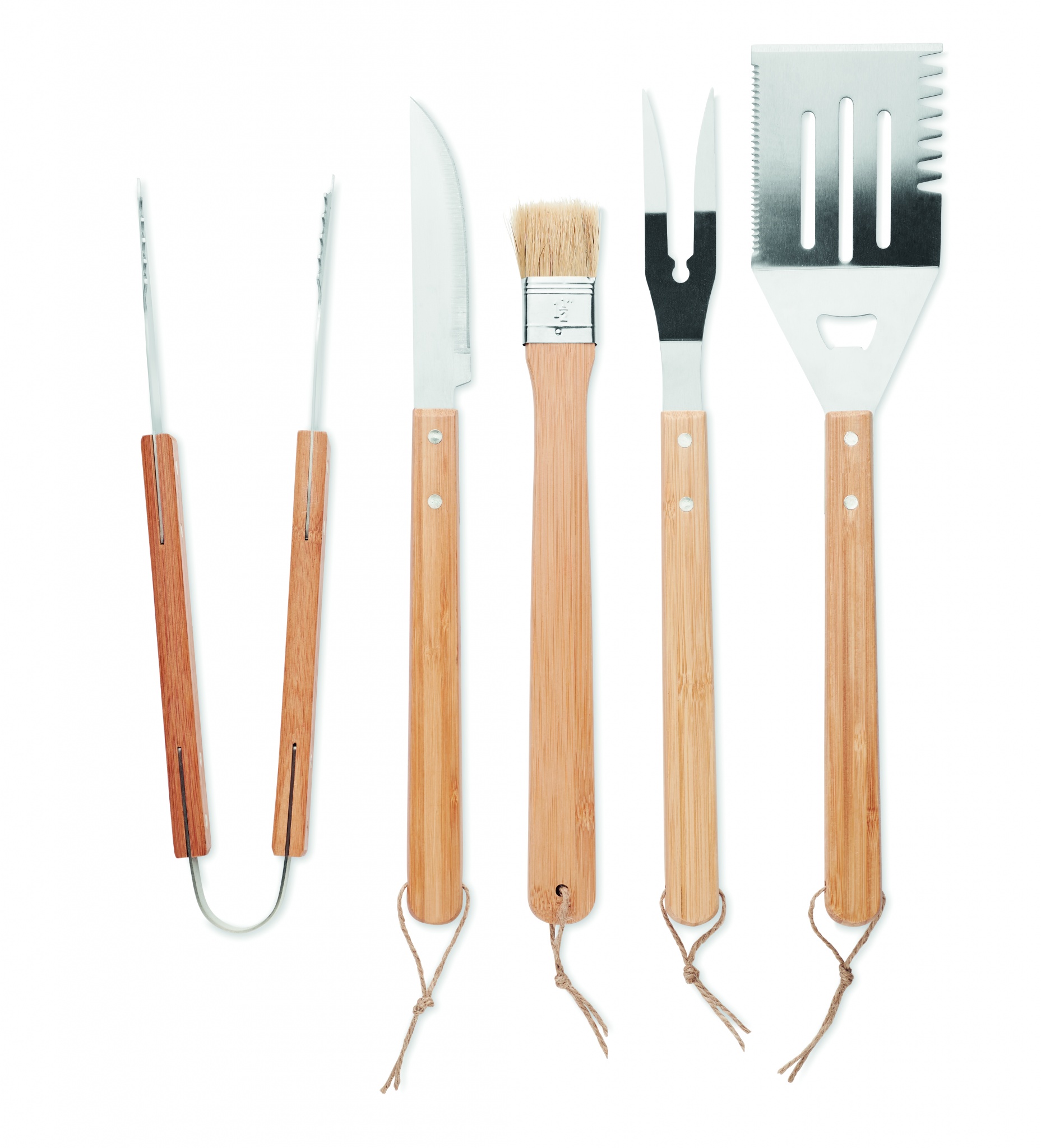 5-piece barbecue Stainless Steel tool set with wooden handle and waxed canvas pouch. Includes Spatula, knife, tongs, fork and basting brush.