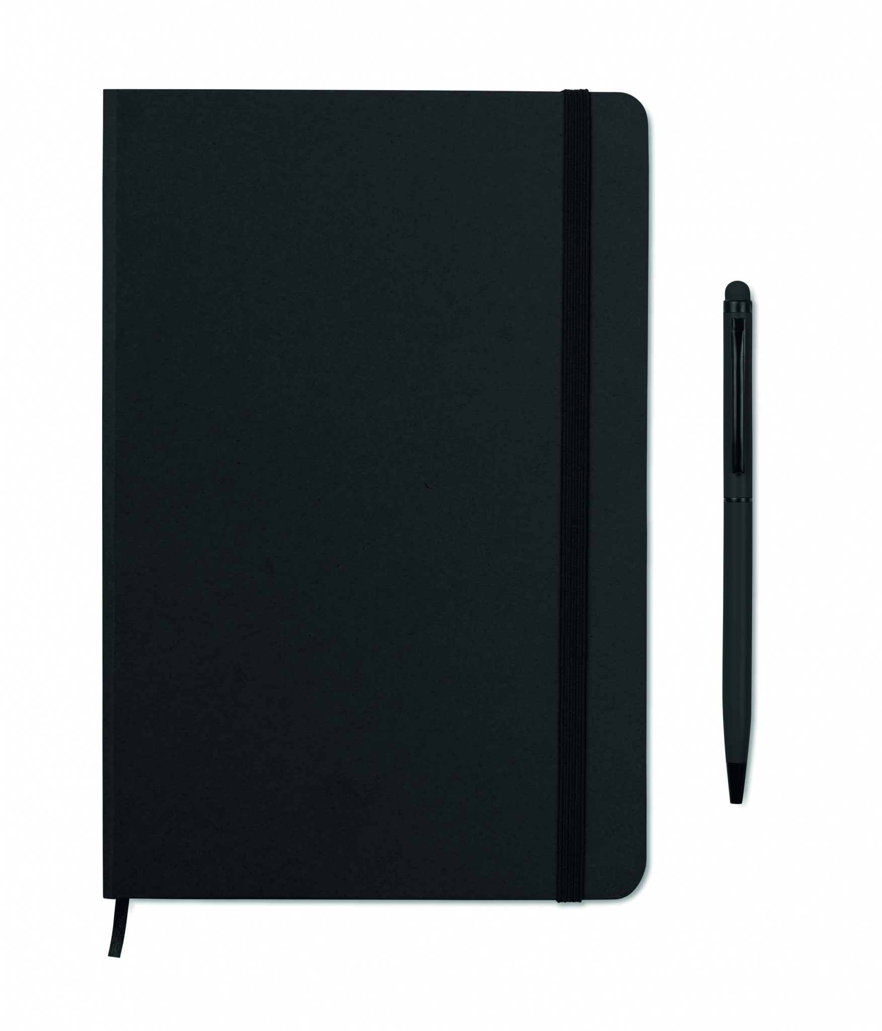 A5 notebook with 2-in-1 stylus ball pen. Hard PU cover. Casebound. 144 lined pages (72 sheets). Matching ball pen with touch screen stylus. Blue ink. Matching elastic closure strap and ribbon bookmark.