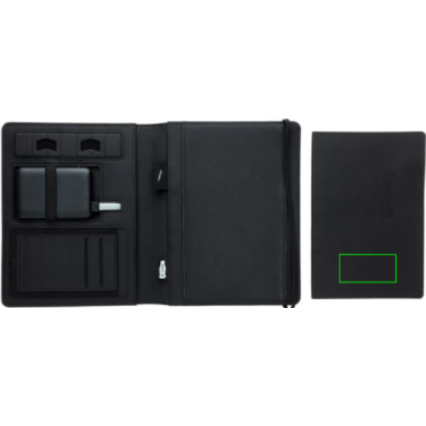 This notebook cover allows you to have your meetings in style. The front cover has a wireless charging pad for your smartphone. (Android latest generations, iPhone 8 and up). Older phones and tablets can be charged via the USB ports with the external 5.000 mAh powerbank. Input: 5.0V/2.1A. Output 1: 5.0V/2.1A. Output 2: 5.0V/2.1A.Wireless Output: 5W. Registered design®