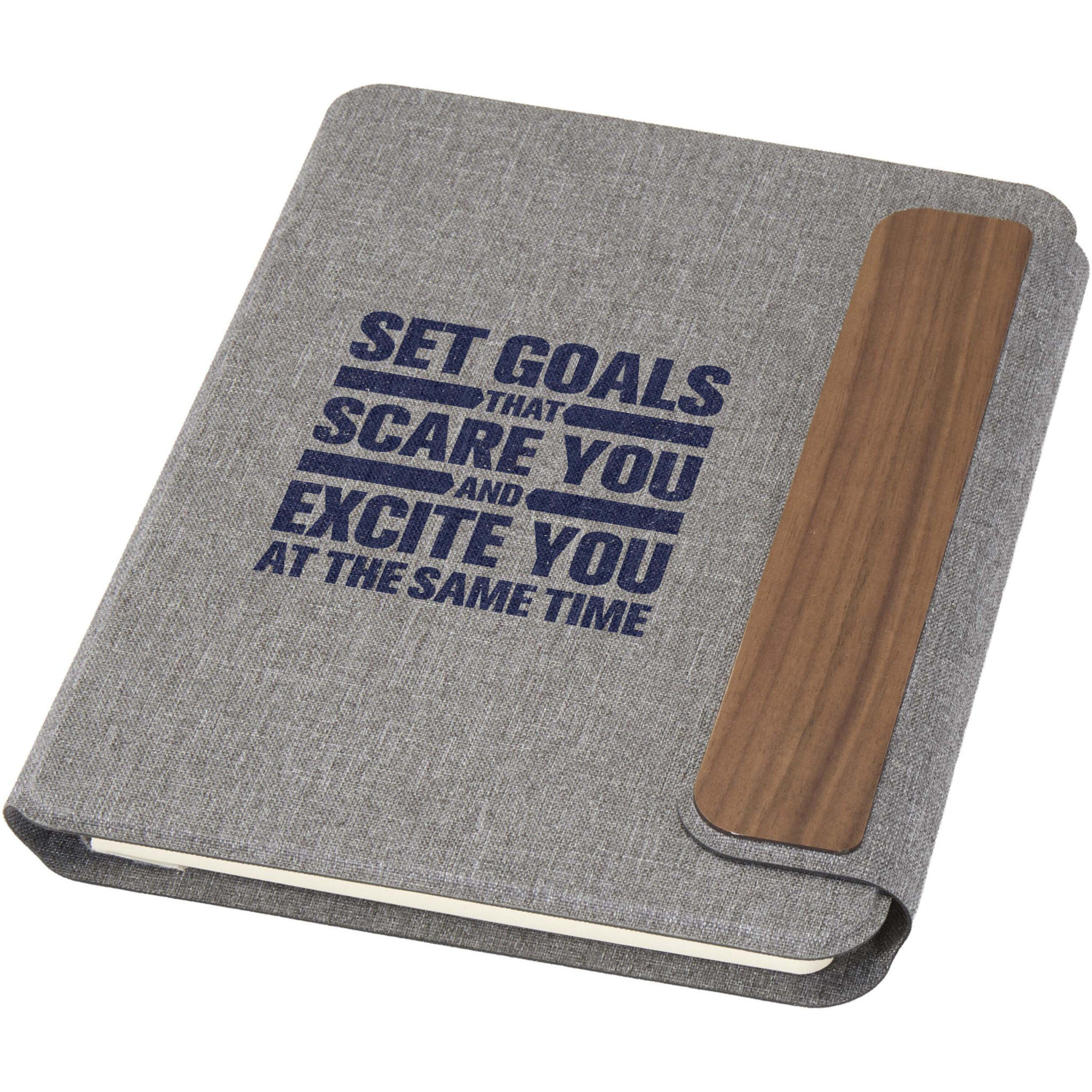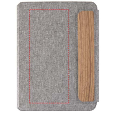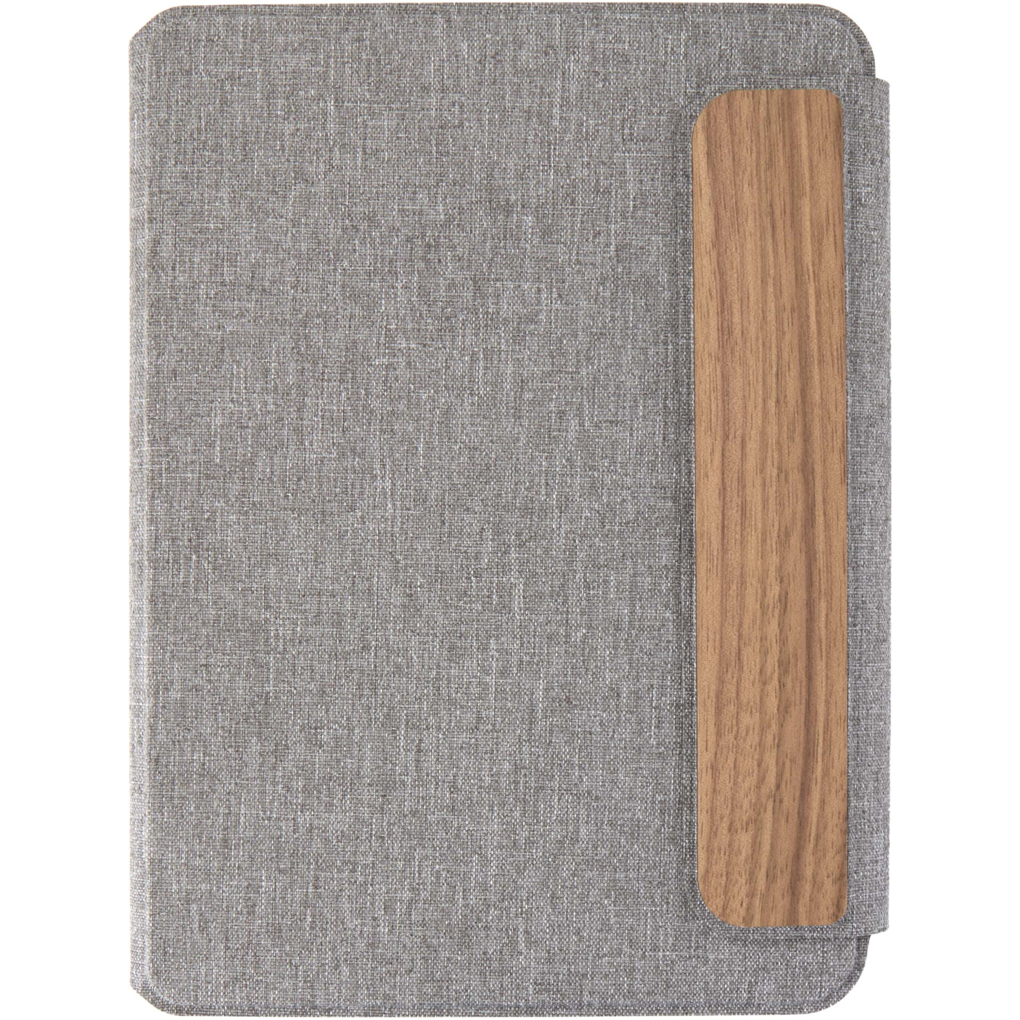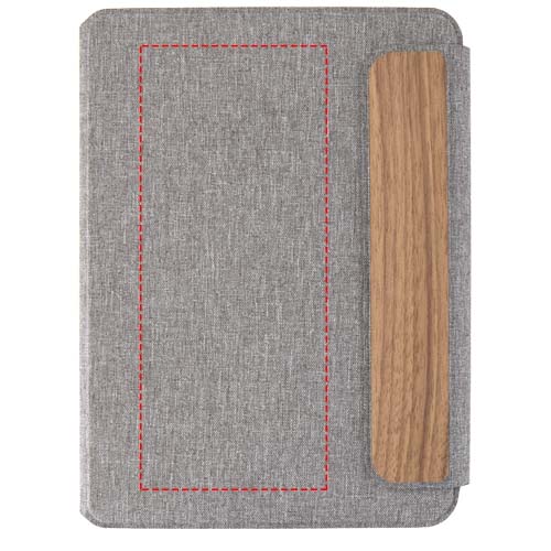 The Andean A5 portfolio is partly made from RCS certified recycled post-consumer polyester, offering a more sustainable alternative by reducing reliance on virgin materials. Designed with a sleek grey hard cover featuring rounded corners and precision welded technology, it is secured with a magnetic closure accented by a refined walnut wood detail—adding a modern and sophisticated touch. Inside, you'll find a removable softcover notebook with 64 cream-coloured lined sheets, made from 80 g/m² responsibly sourced paper. Presented in a kraft-coloured paper sleeve.