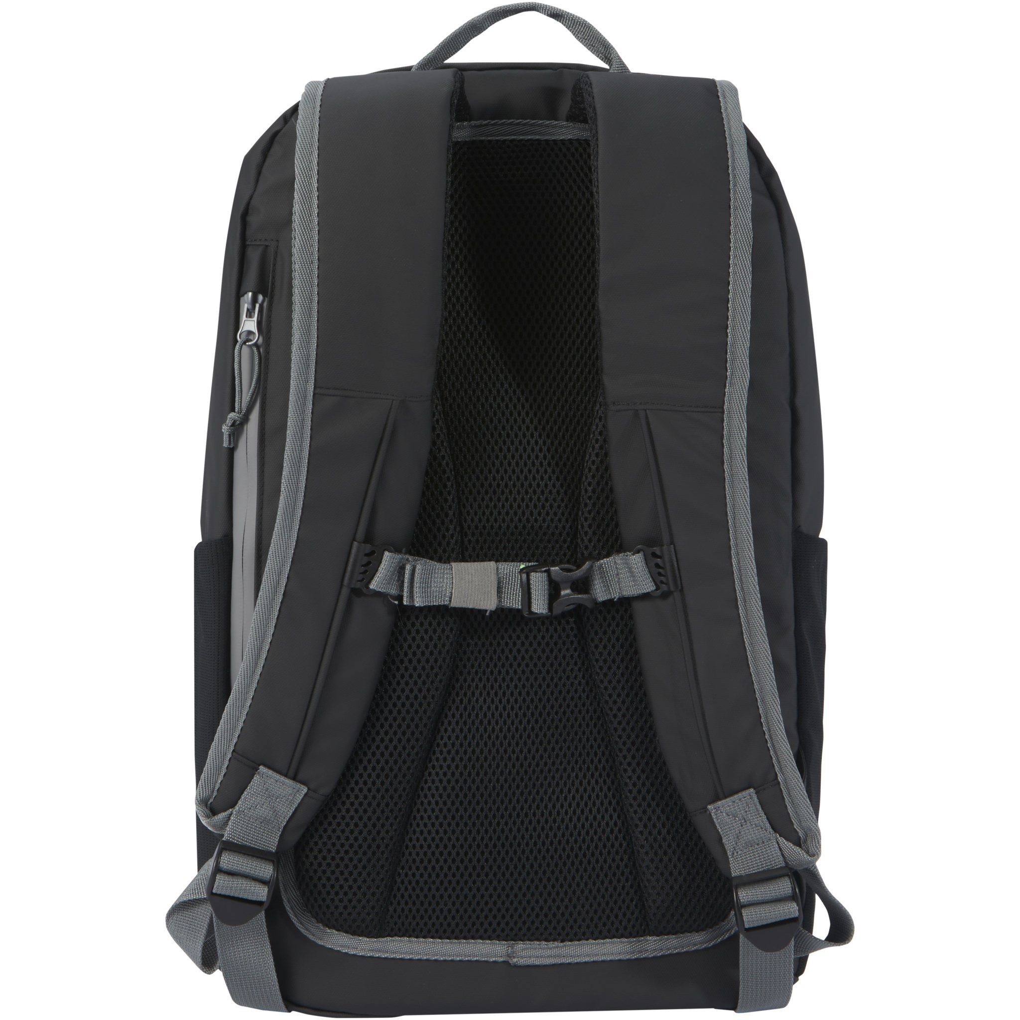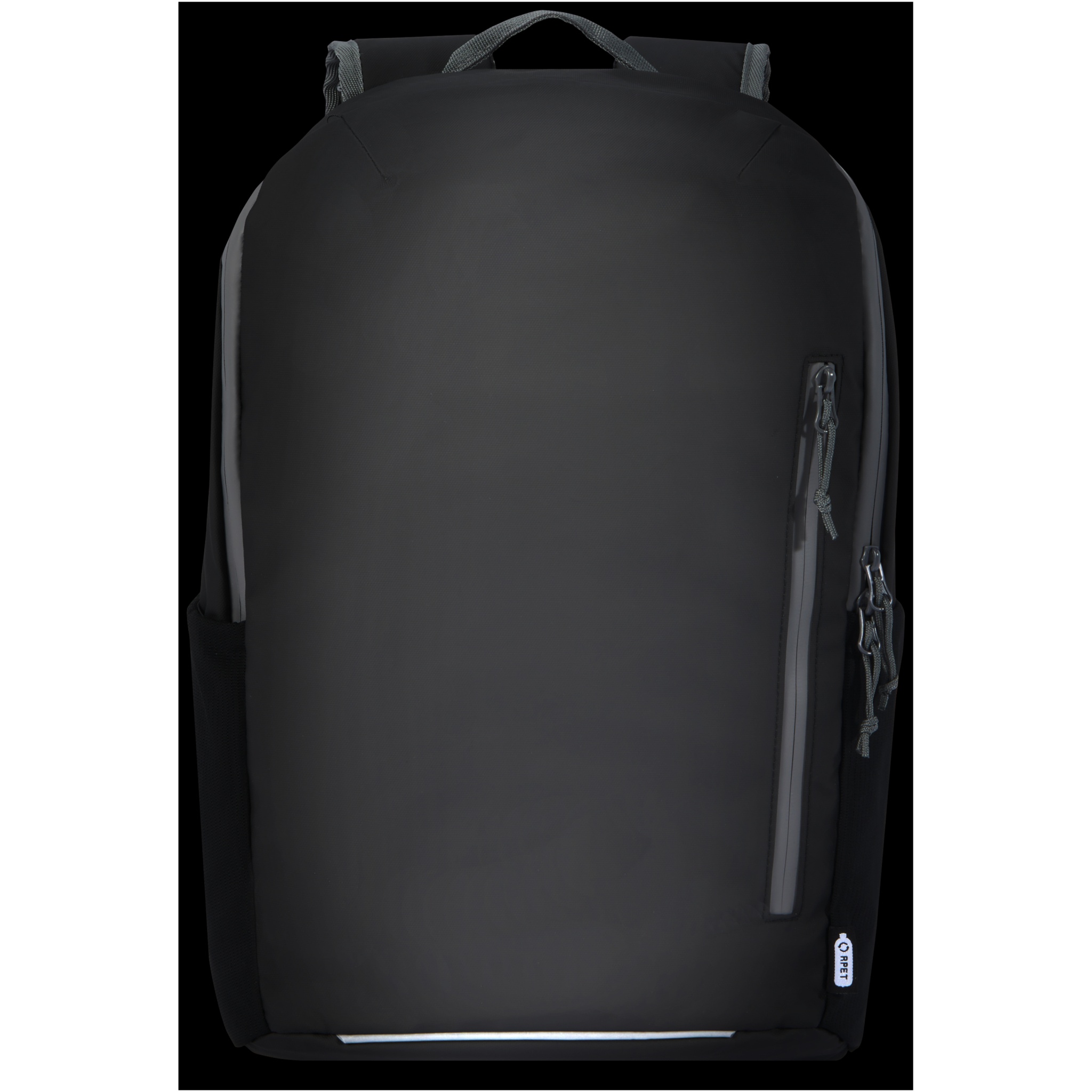 Water-resistant laptop backpack made from GRS certified recycled materials, including the zips. It features a padded 15" laptop compartment with side opening for quick access, multiple mesh pockets, zipped front pocket, and reflective piping for visibility. The moulded and padded backing and adjustable chest strap makes it comfortable to carry around even when fully loaded. The GRS recycled materials include the main fabric, lining, webbing, and zips. Capacity: 21 litres. PVC free.