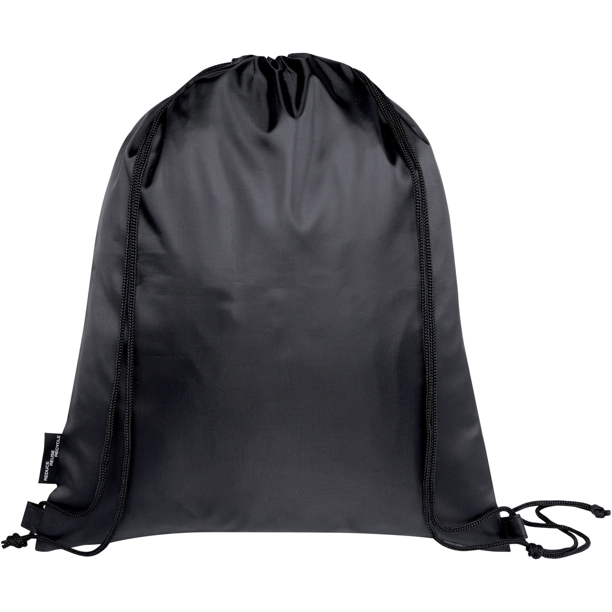 The Ash foldable recycled drawstring bag features a main compartment with cinch closure, and a zippered front pocket that the bag can easily fold up into for easy transport and storage.