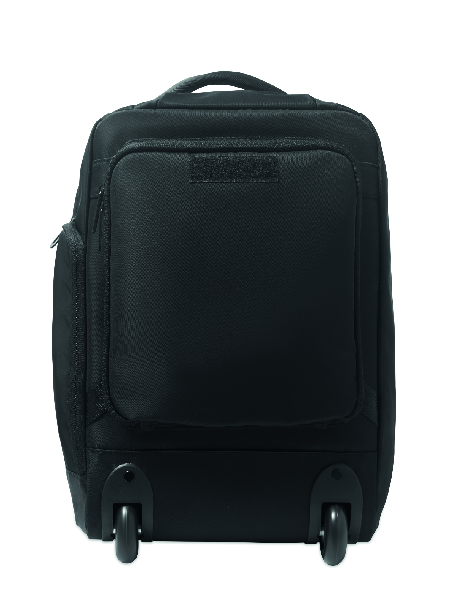 Backpack trolley in 290T RPET polyester with three front zip pockets, padded 15'' '' laptop compartment, and zippered cooling section. Features padded back, straps, and rear zip strap compartment.