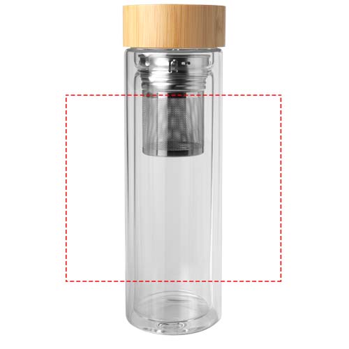 Double walled borosilicate glass water bottle with a tea infuser and bamboo lid. The bamboo used comes from sustainable, environmentally friendly and socially responsible sources. Volume capacity: 400 ml. Delivered in a recycled cardboard box.