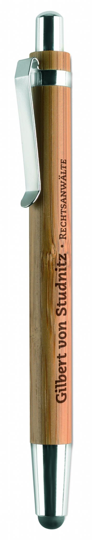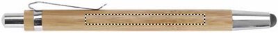 Push button ball pen in bamboo with stylus and shiny chrome fitting. Blue ink. Bamboo is a natural product, there may be slight variations in colour and size per item, which can affect the final decoration outcome.