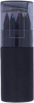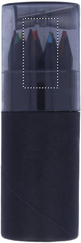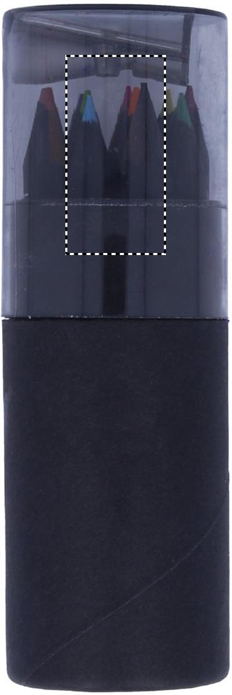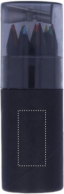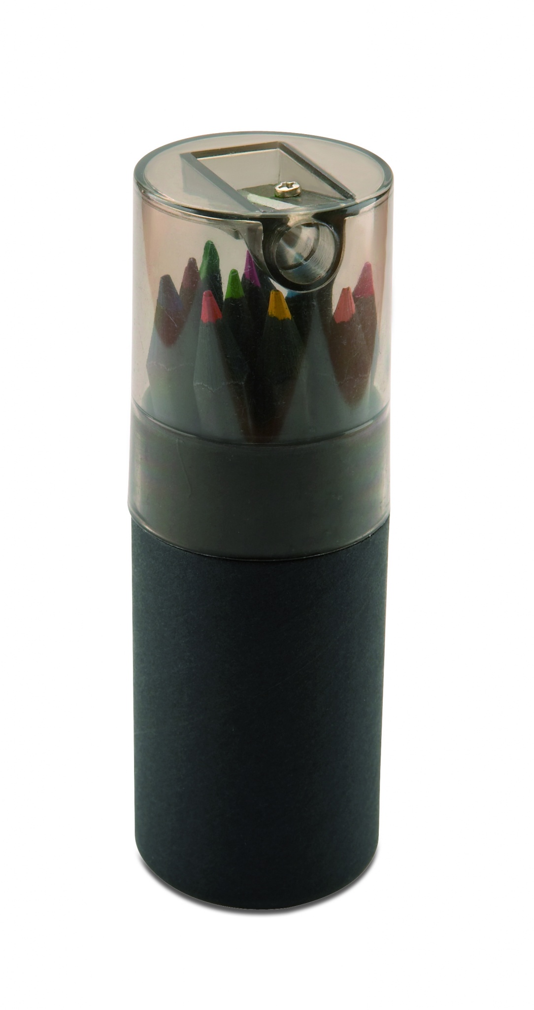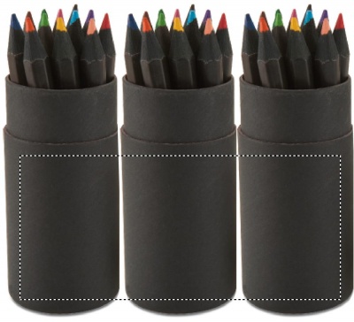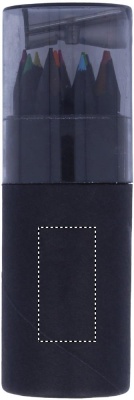 This black coloured paper tube box contains 12 colouring pencils and a pencil sharpener in the lid of the box.