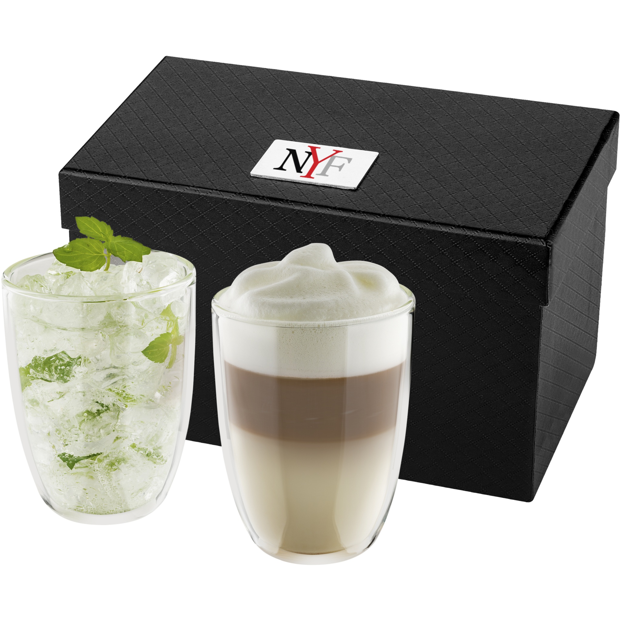 Double walled isolating 290 ml glass set. Ideal for serving your favorite latte macchiato, ice tea or any hot or cold drinks. Presented in a luxury gift box. Logo plate included.