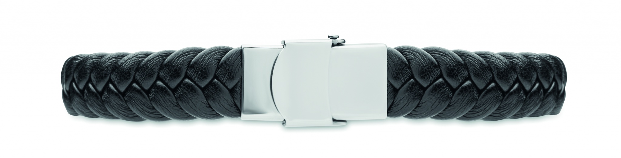 Braided faux leather cuff bracelet with polished steel hardware. Push-lock clasp. Wrist circumference: 21 cm.
