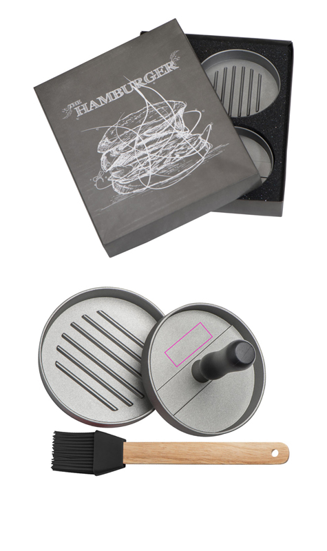 Aluminum burger patty press with silicone brush, packed in an individual box. We stick your logo with a label on the box.