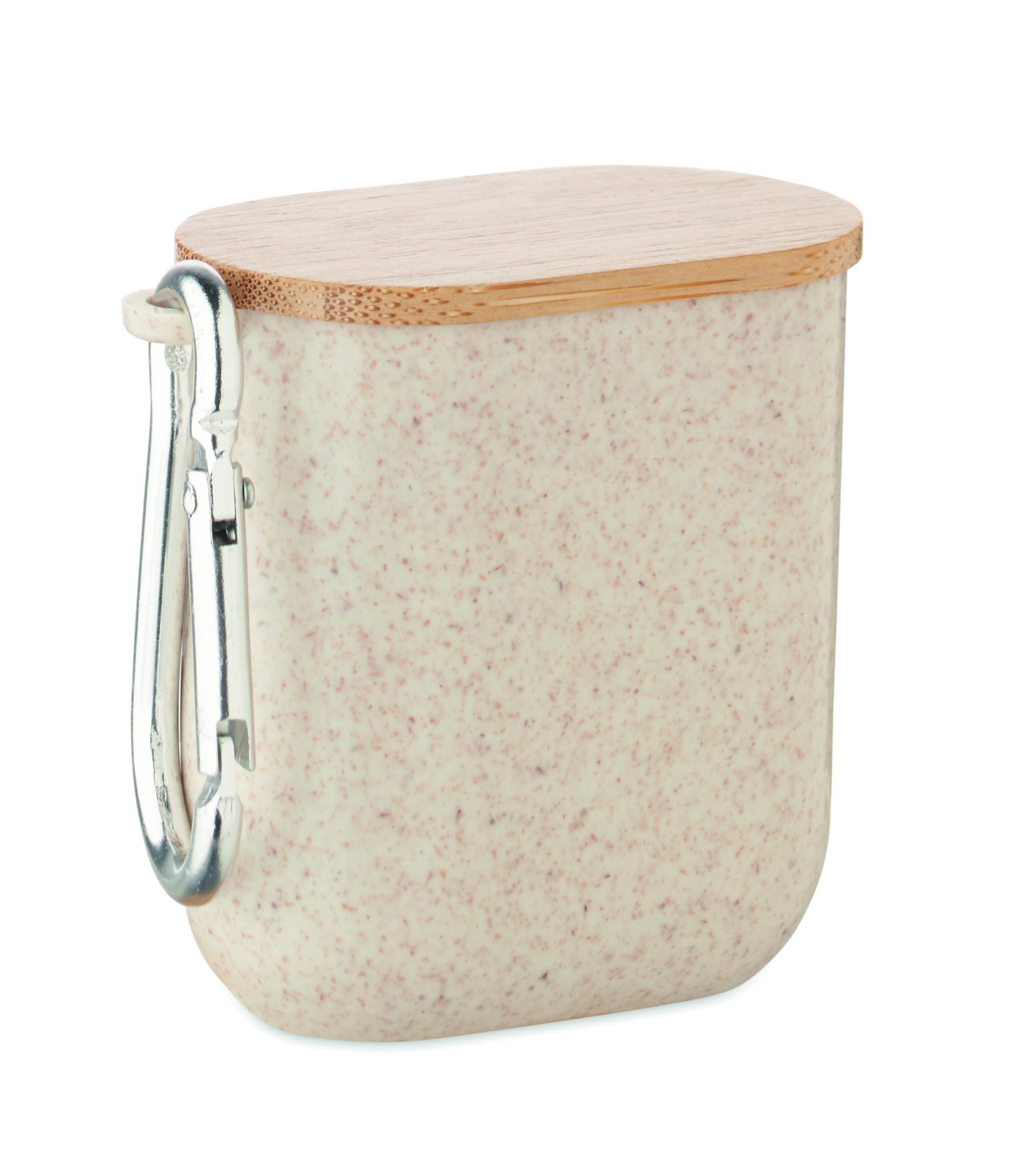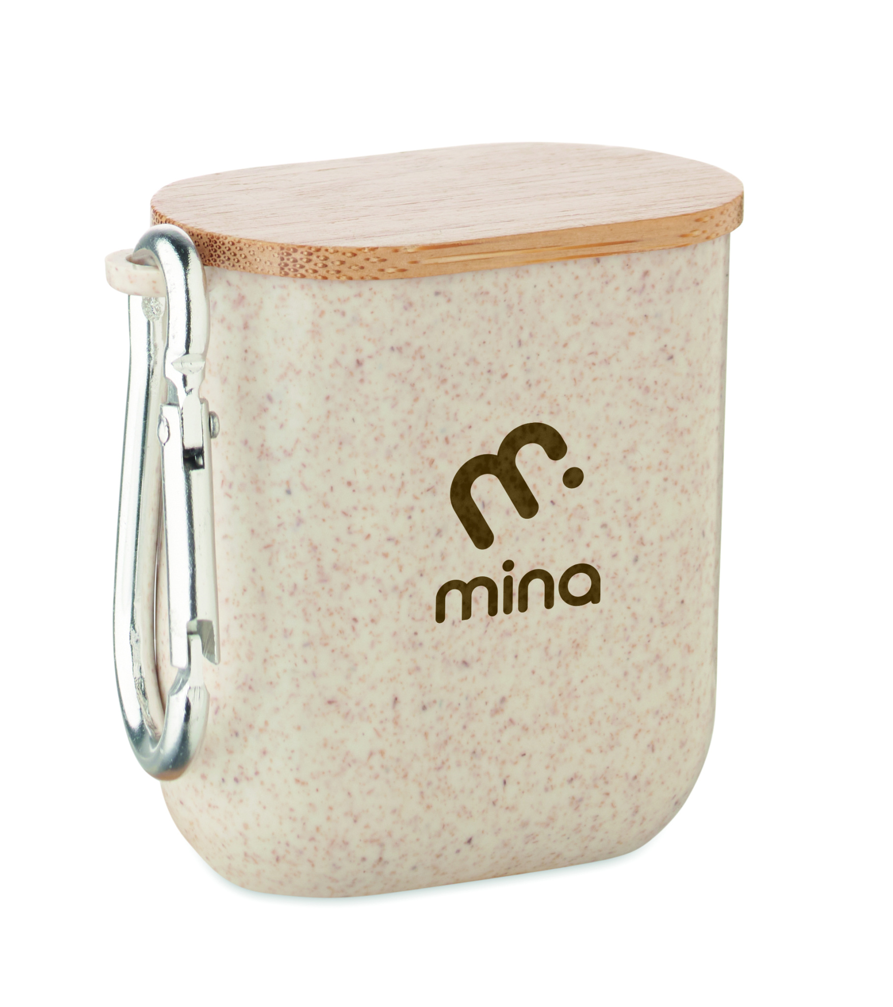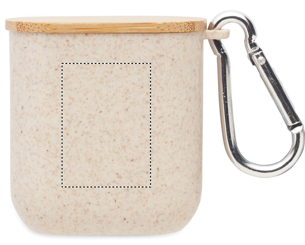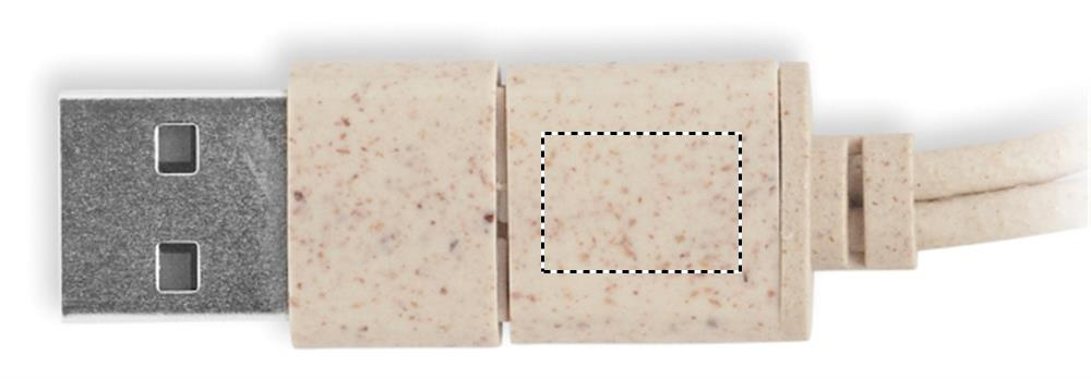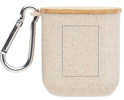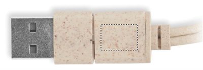 Cable set in wheat straw/ABS case with bamboo top and carabiner. Lid serves as phone stand (in horizontal position). Cable input 2in1 USB-C/A, output Type-C and 2 in 1 pin.