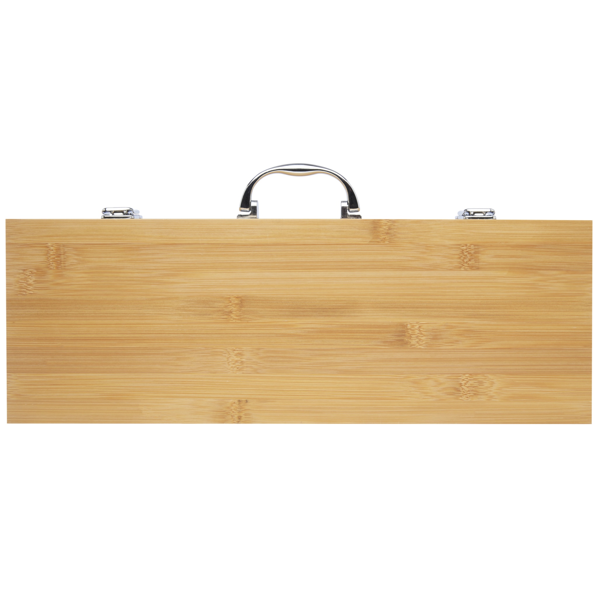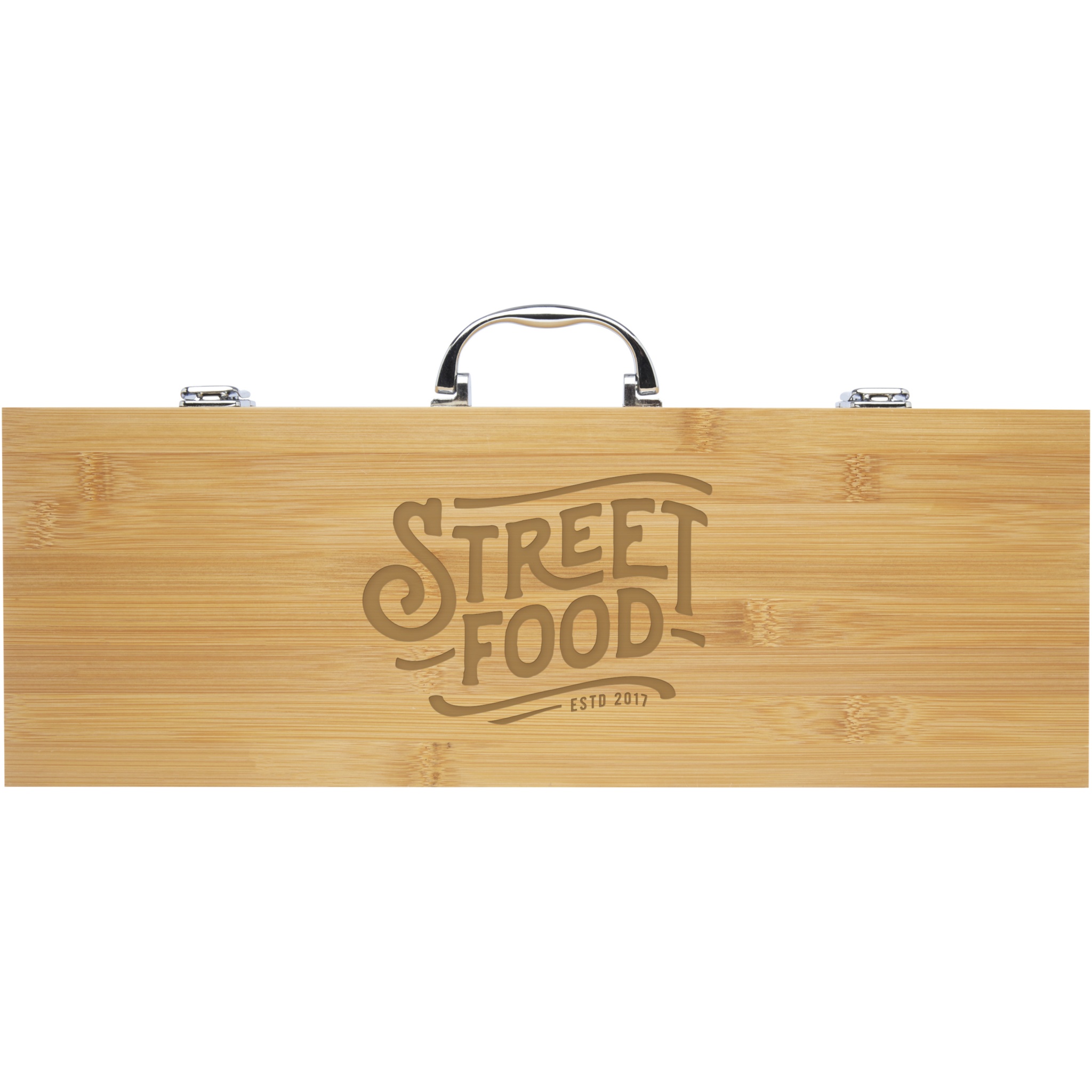 Bamboo 5-piece BBQ set with a shovel (40 x 9.5 cm), tong (34.5 x 6 cm), fork (38.5 x 3 cm), knife (38.5 x 3 cm), and brush (38 x 4.3 cm). The set is delivered in a bamboo gift box (46 x 16.2 x 7.4 cm). The handles and gift box are made of bamboo that is sourced and produced following sustainable standards.
