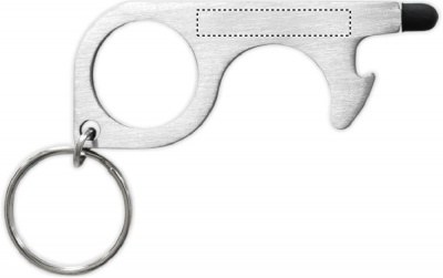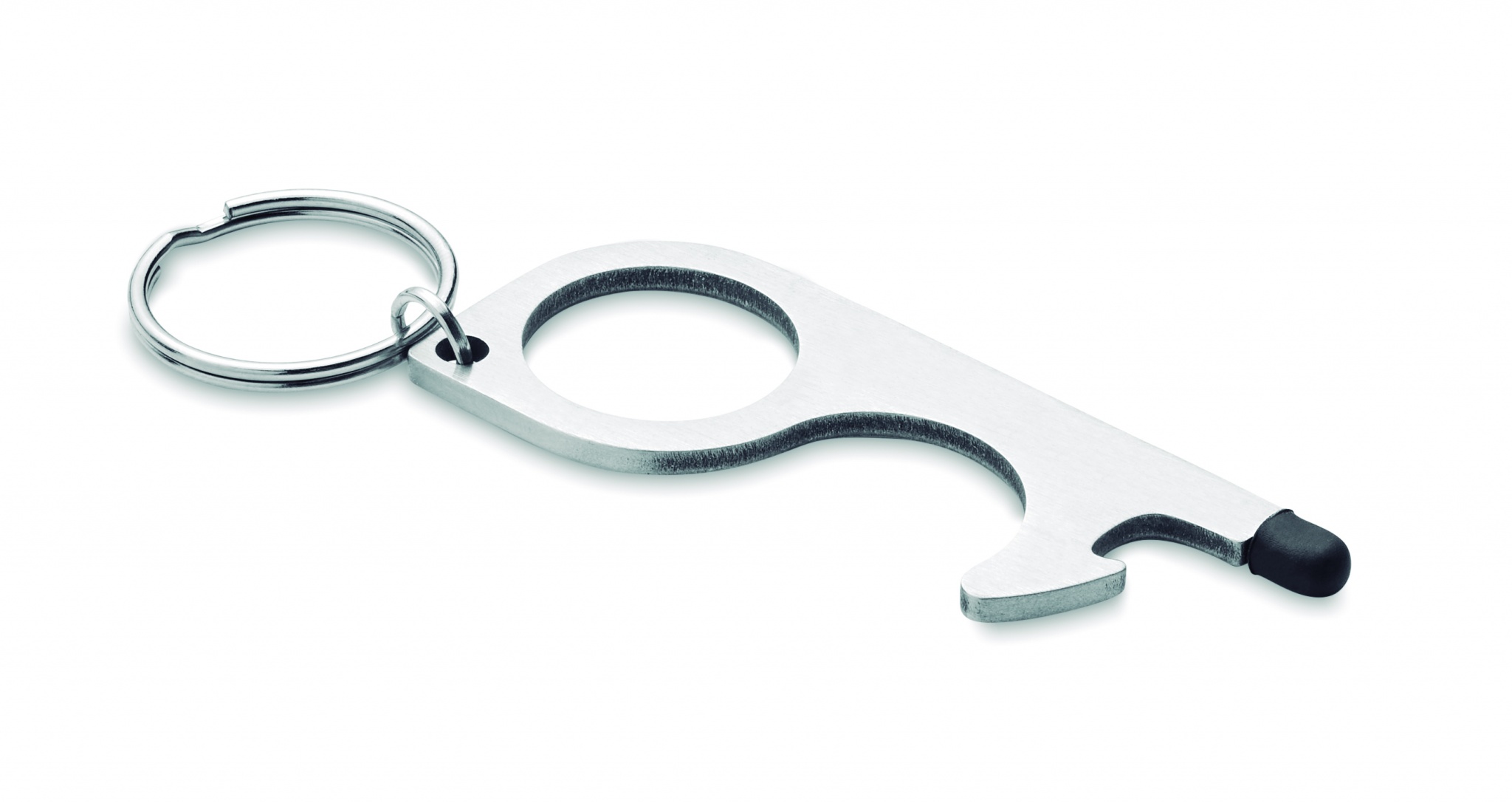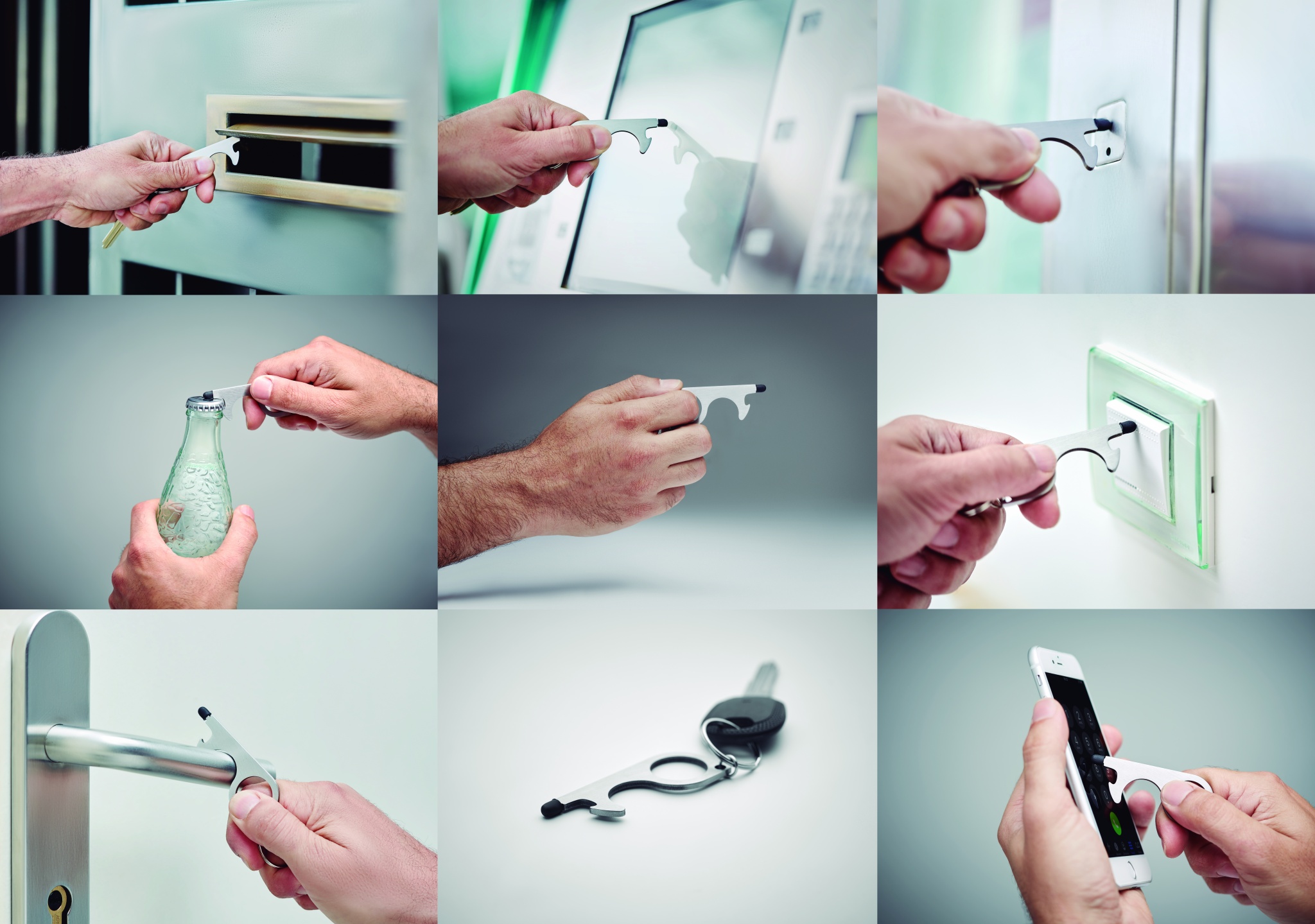 Multifunctional 5-in-1 no touch keyring. Open doors, press buttons of elevators, traffic lights, ATM`s and mobile devices without touching them. Including a bottle opener, stylus and key ring. The easy way to prevent spreading germs.