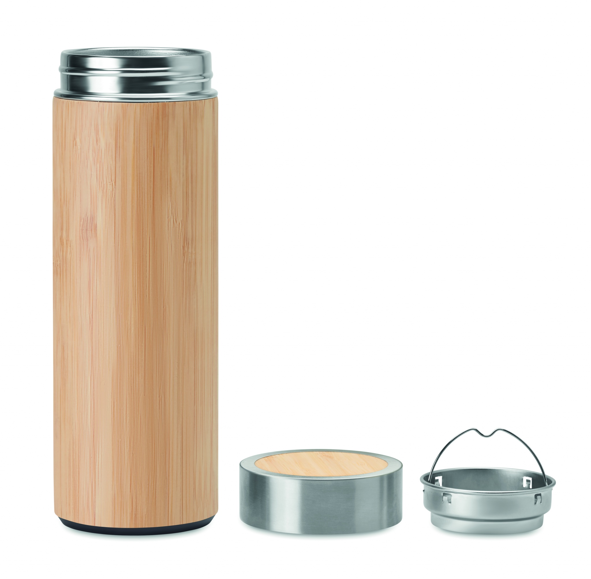 Double wall stainless steel insulating vacuum flask with bamboo cover and additional tea infuser. Capacity: 400 ml. Bamboo is a natural product, there may be slight variations in colour and size per item, which can affect the final decoration outcome. Bamboo is a natural product, there may be slight variations in colour and size per item, which can affect the final decoration outcome.