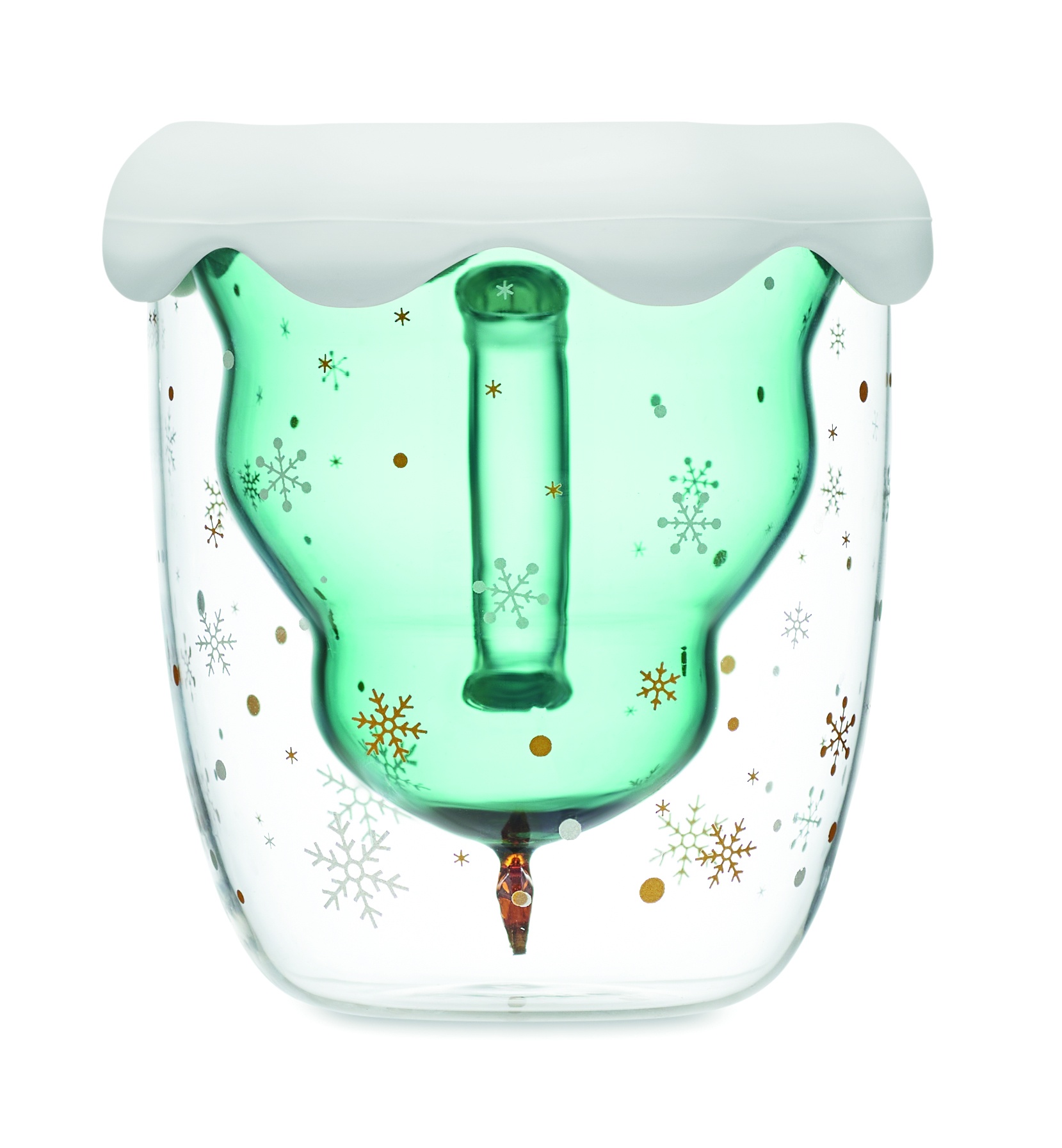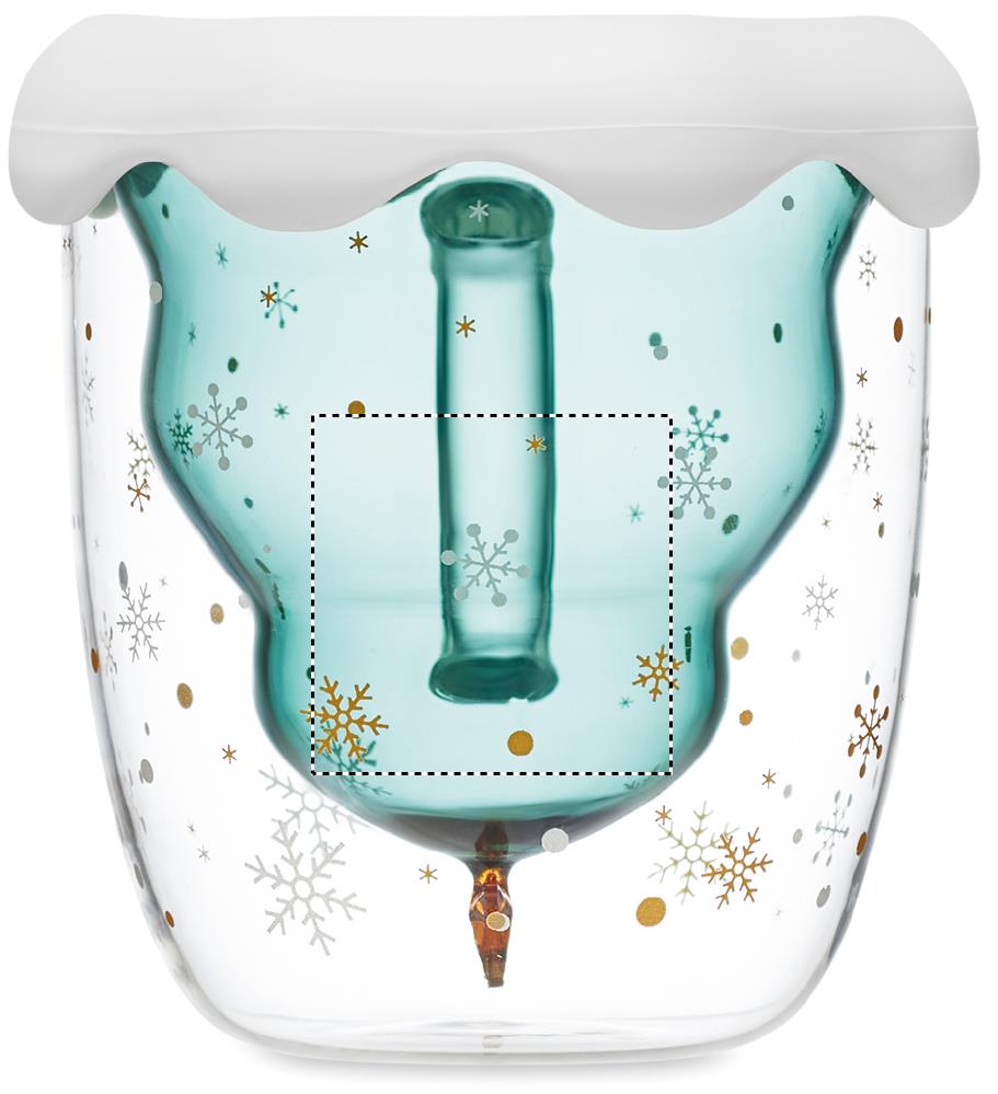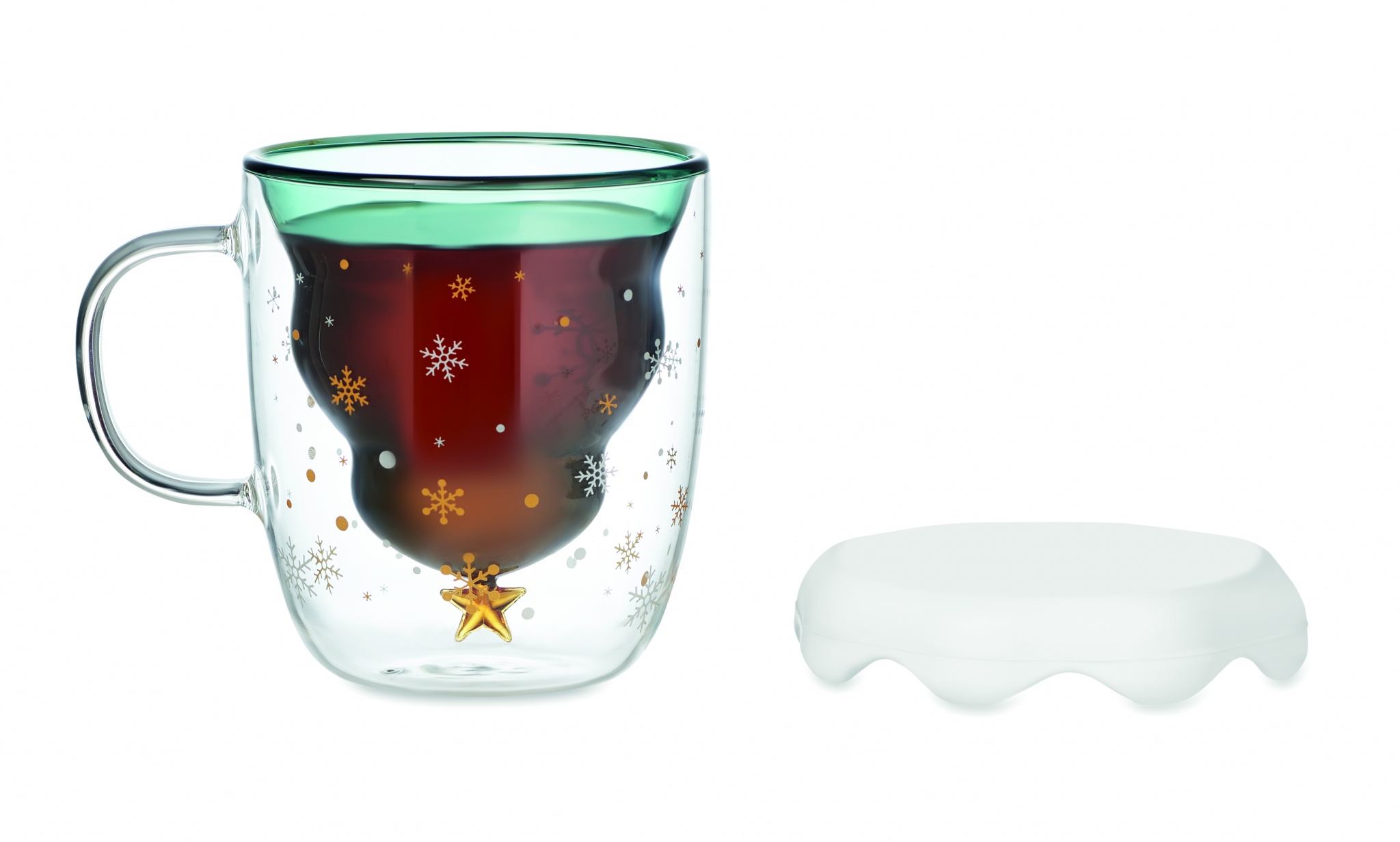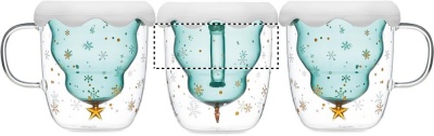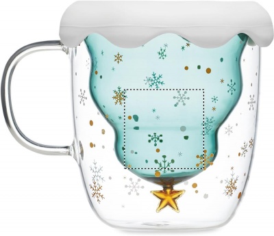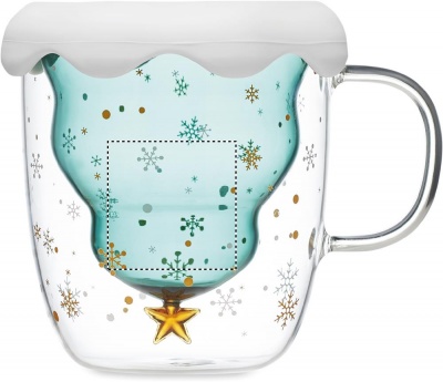 Double wall borosilicate mug with seasonal design and silicone lid and coaster. Capacity: 250ml.