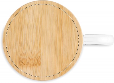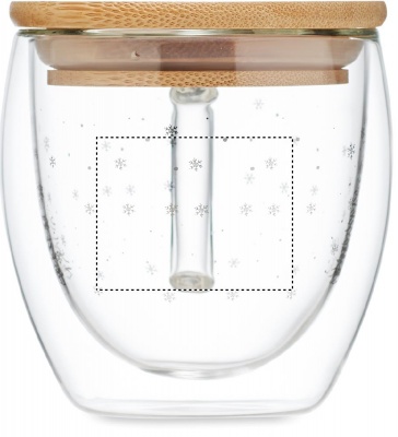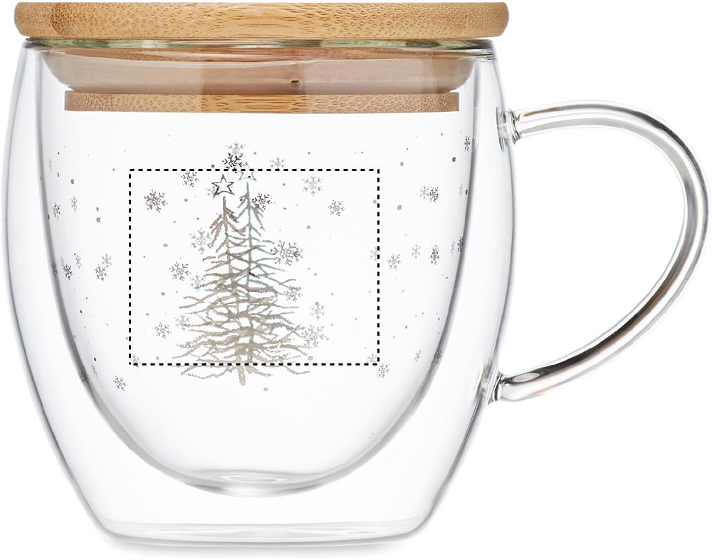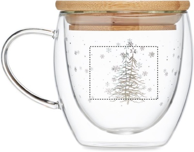 Double wall borosilicate mug with tree design and bamboo lid. Capacity: 220 ml. Bamboo is a natural product, there may be slight variations in colour and size per item, which can affect the final decoration outcome.