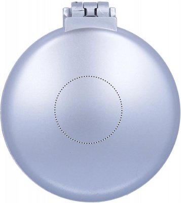Foldable hair brush and mirror in plastic housing. Silver spray finish.