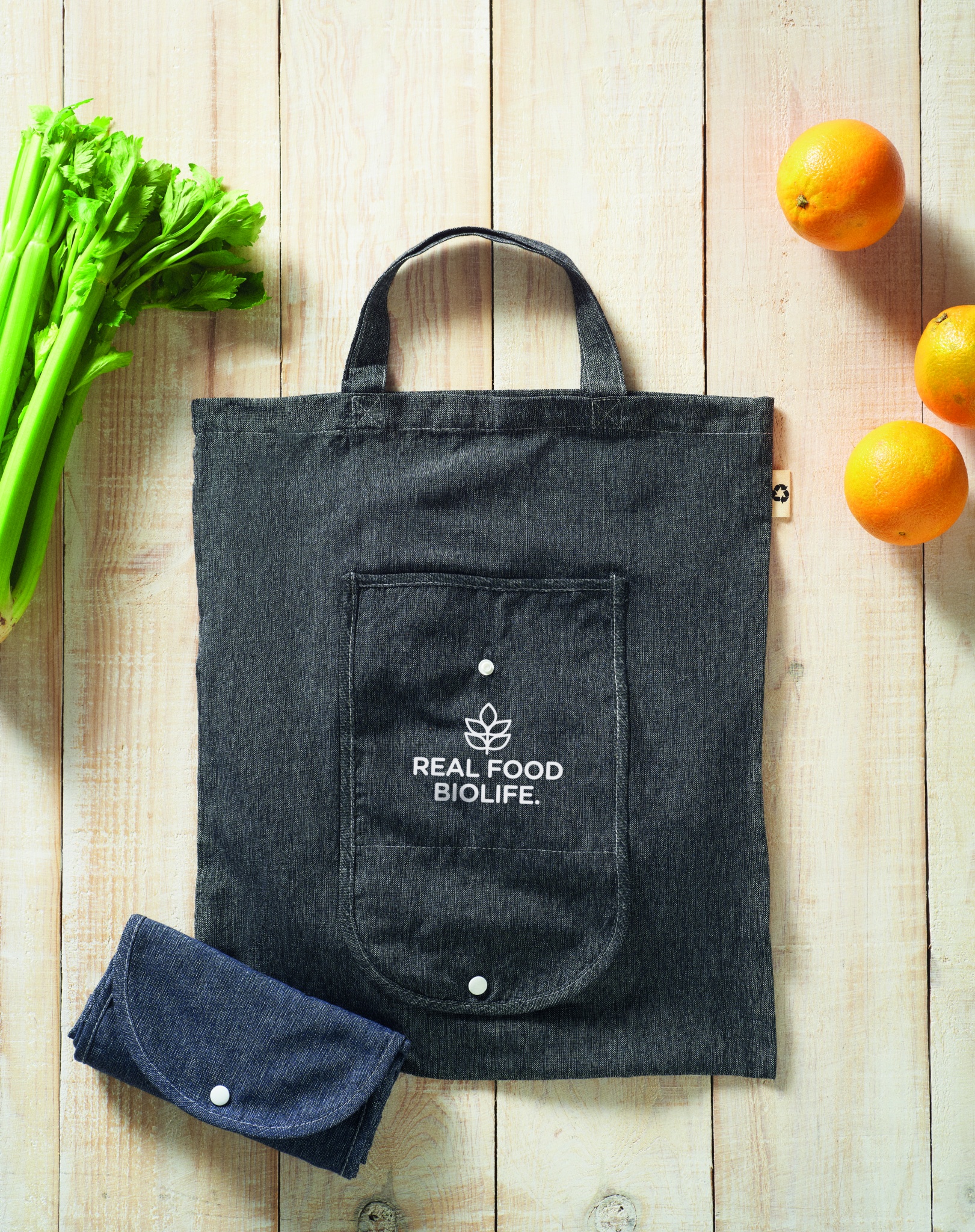 Foldable 2 tone recycled cotton and recycled polyester shopping bag with long handles (20%/80%). Approx. 140 gr/m². This item can shrink after printing.