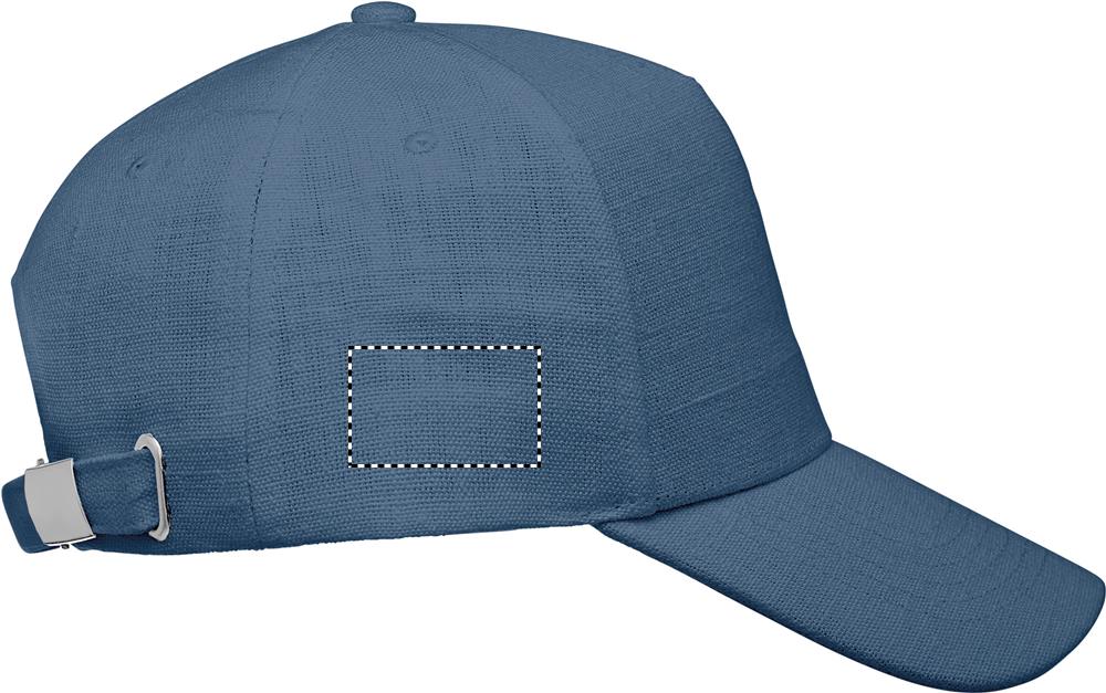 5 panel baseball cap in 100% hemp fabric 370 gr/m² with brass clips on adjustable strap closure. 5 stitched eyelets in matching colour. Size 7 1/4.