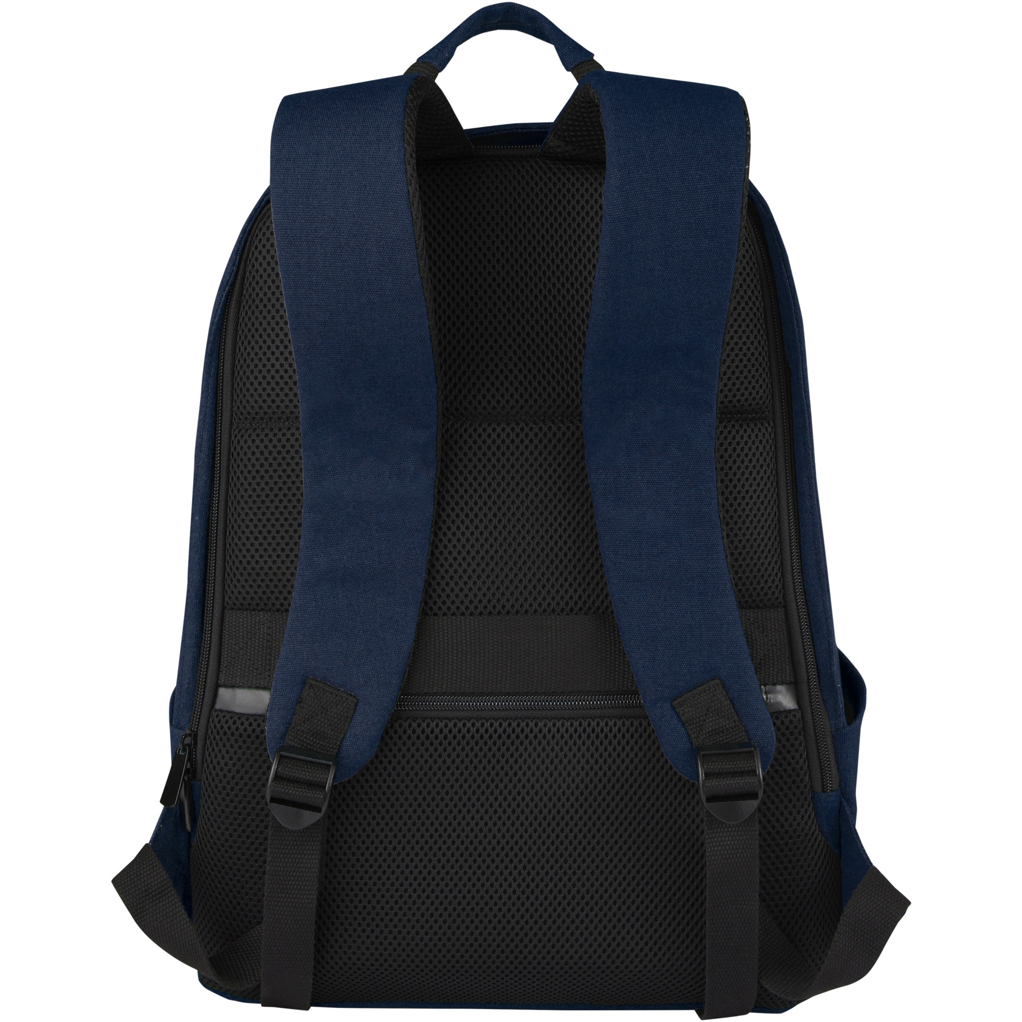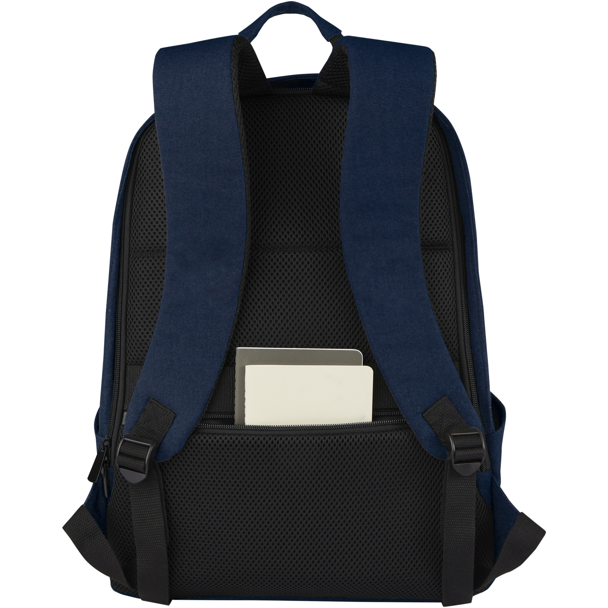 Composed with highly durable and sustainable materials, GRS recycled canvas and GRS RPET lining, the Joey anti-theft backpack features a dedicated tablet sleeve along with a 15.6" padded laptop compartment. The backpack also has a mesh pocket and organisational pockets inside to keep contents well organized, 2 side water pockets, one zippered front pocket, and a hidden pocket on the back for easy and safe access on the go. The decorative metal plate can make a logo shine through its subtle and matt finish.