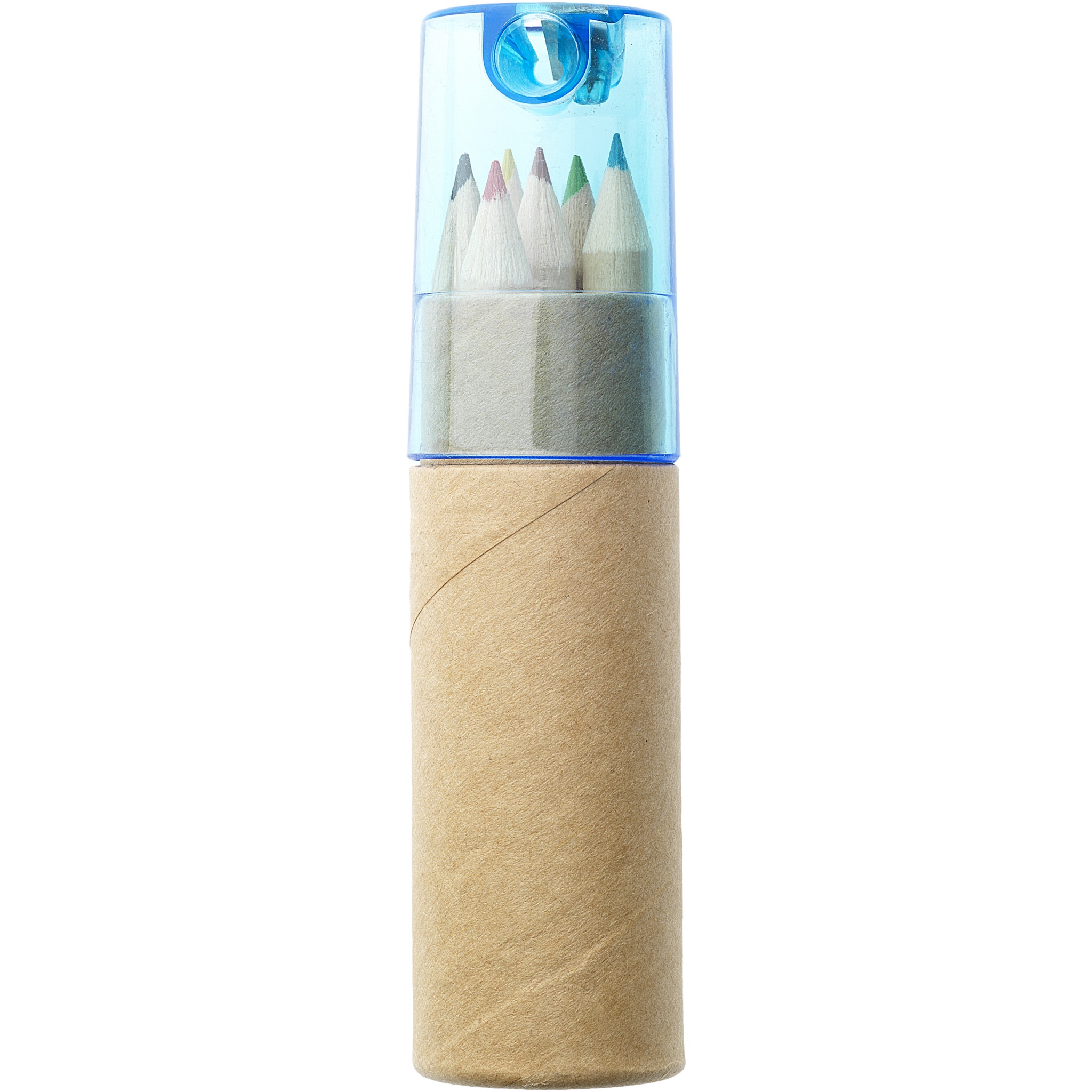 6 coloured pencils in cardboard cylinder box with sharpener in plastic lid. Decoration not available on components.