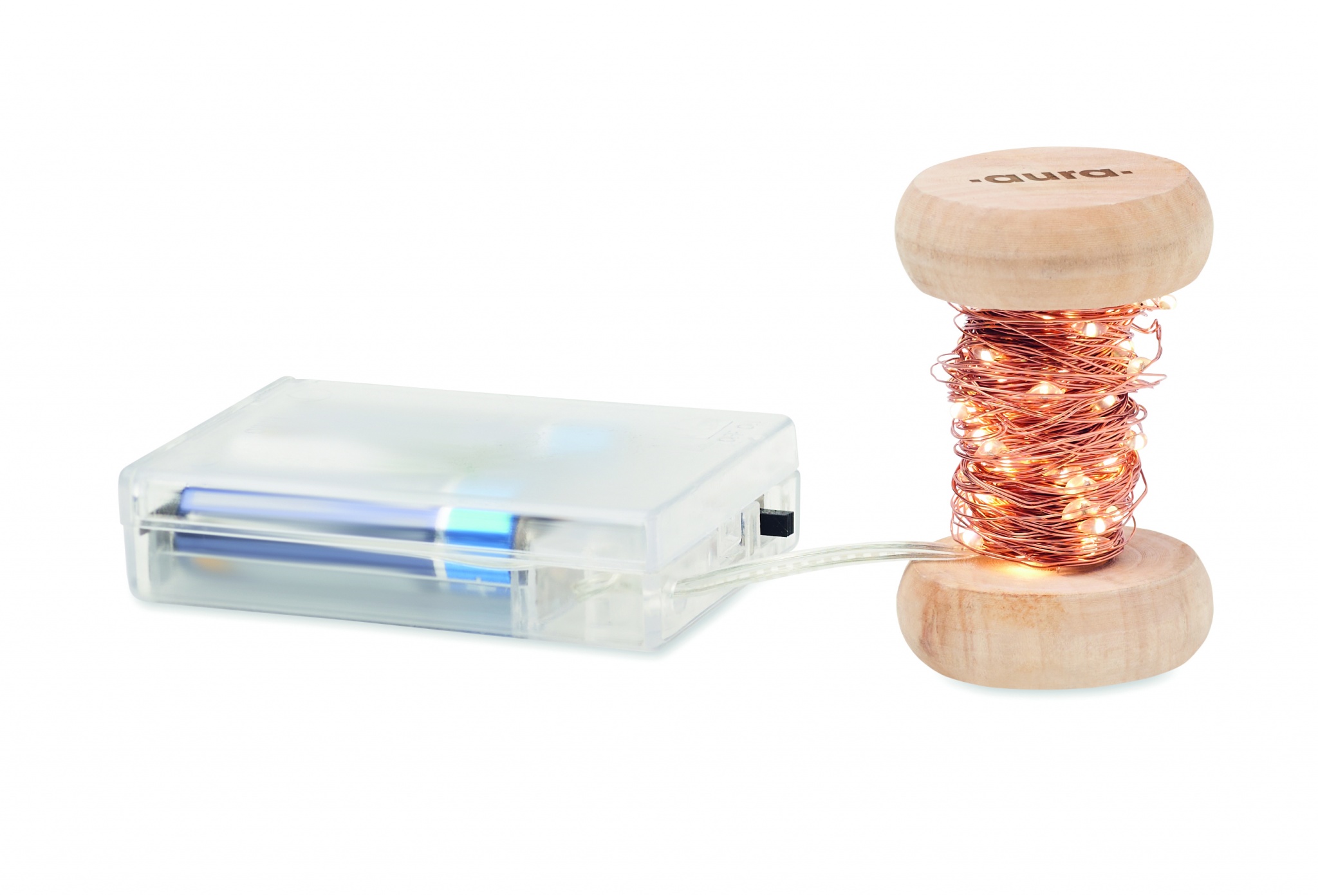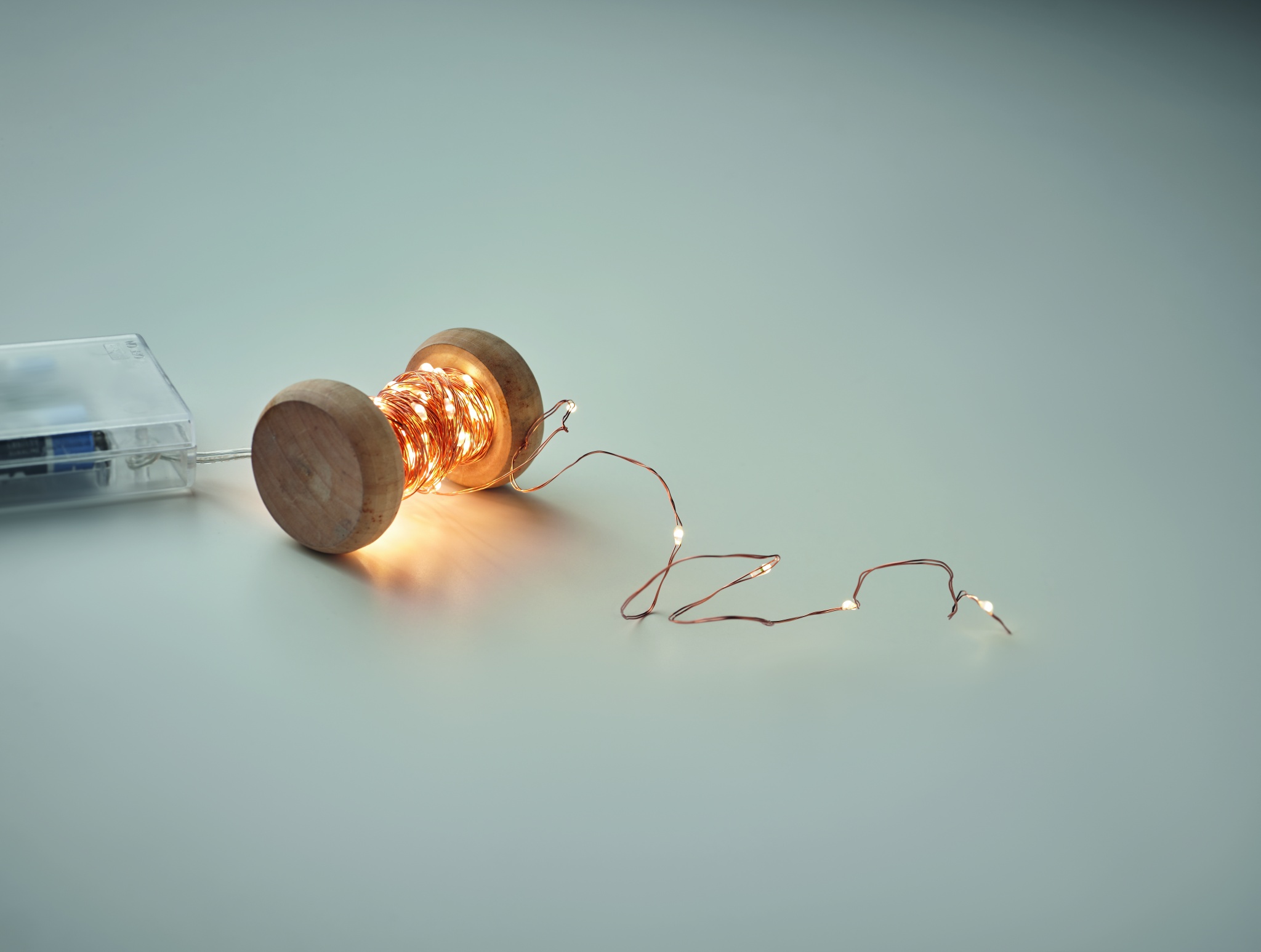 String of 50 LED fairy lights in warm yellow light on a wooden spool. Length: 5m. 3 AA batteries not included.