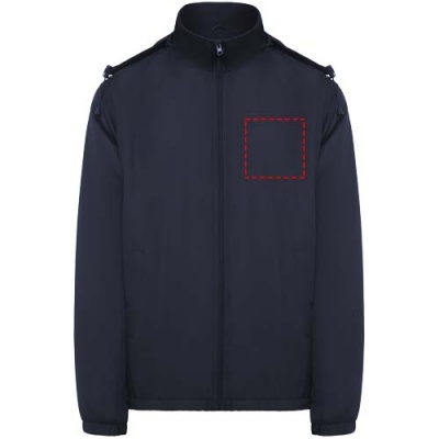 Light waterproof jacket. High collar and foldable hood with adjusters. Microfleece lining. Front zip and chin protector. Elastic cuffs. Two side pockets with zip. Interior left chest pocket. Removable label. Waterproof. Wind-proof. The male model is 184 cm and is wearing size L, and the female model is 174 cm and is wearing size S.