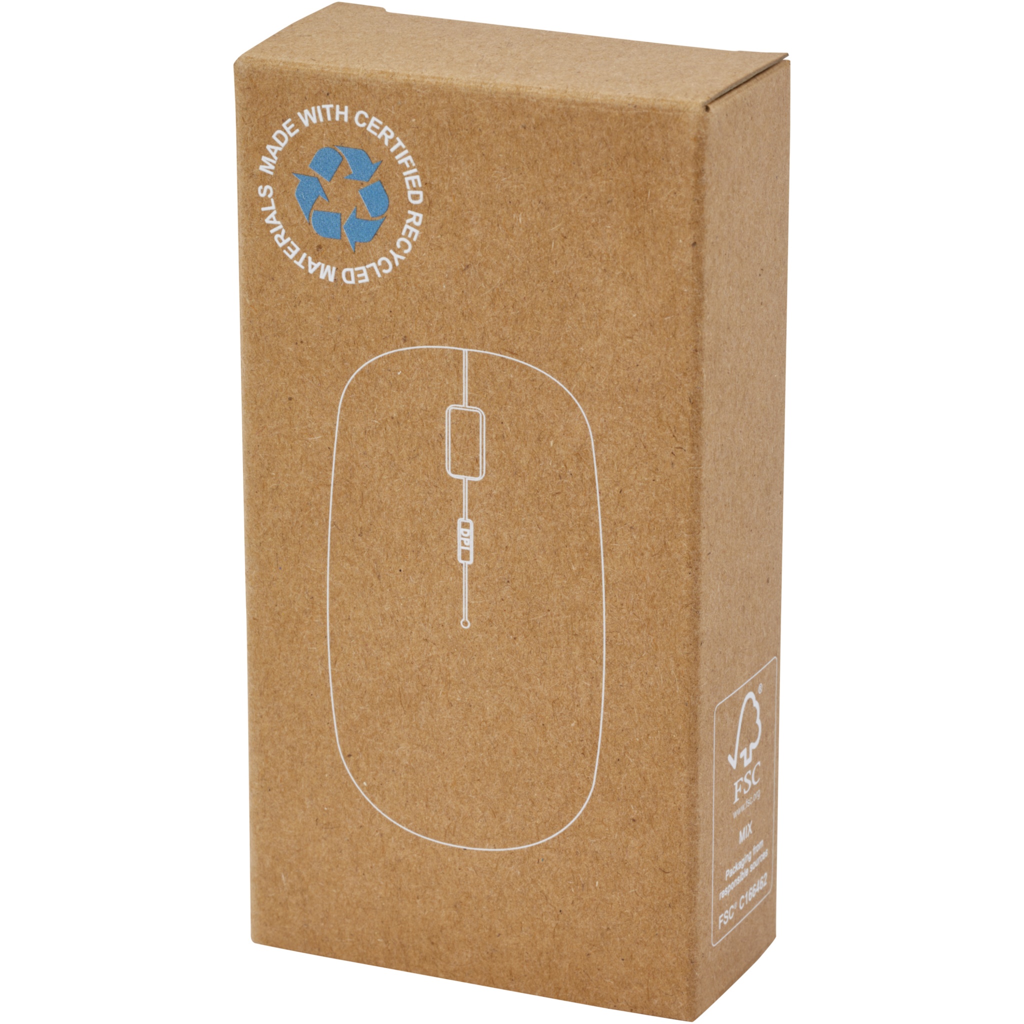 Stylish and bright optical 4-button mouse made of recycled plastic, with an USB receiver for wireless RF connection and special DPI function (800/1200/1600 DPI). The DPI button makes it possible to quickly change the sensitivity of your mouse which is very convenient during gaming. Requires 2x AAA batteries (not included). Compatible with Windows and Mac operating systems. Delivered in a kraft paper box.