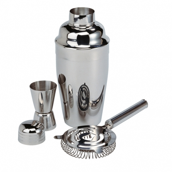 Shaken, not stirred! With this high-quality chromed cocktail set you'll mix like a professional barman. The set contains 1 shaker, 1 measuring pitcher and 1 strainer with 2 supports. The strainer applies to the size of the glass thanks to its spiral, so that all bigger fruit or ice pieces are kept away from the glass when pouring. Rustproof stainless steel makes quality strainers indestructible. We will place your logo by means of laser engraving on the shaker. Each set is packed in a gift box.
