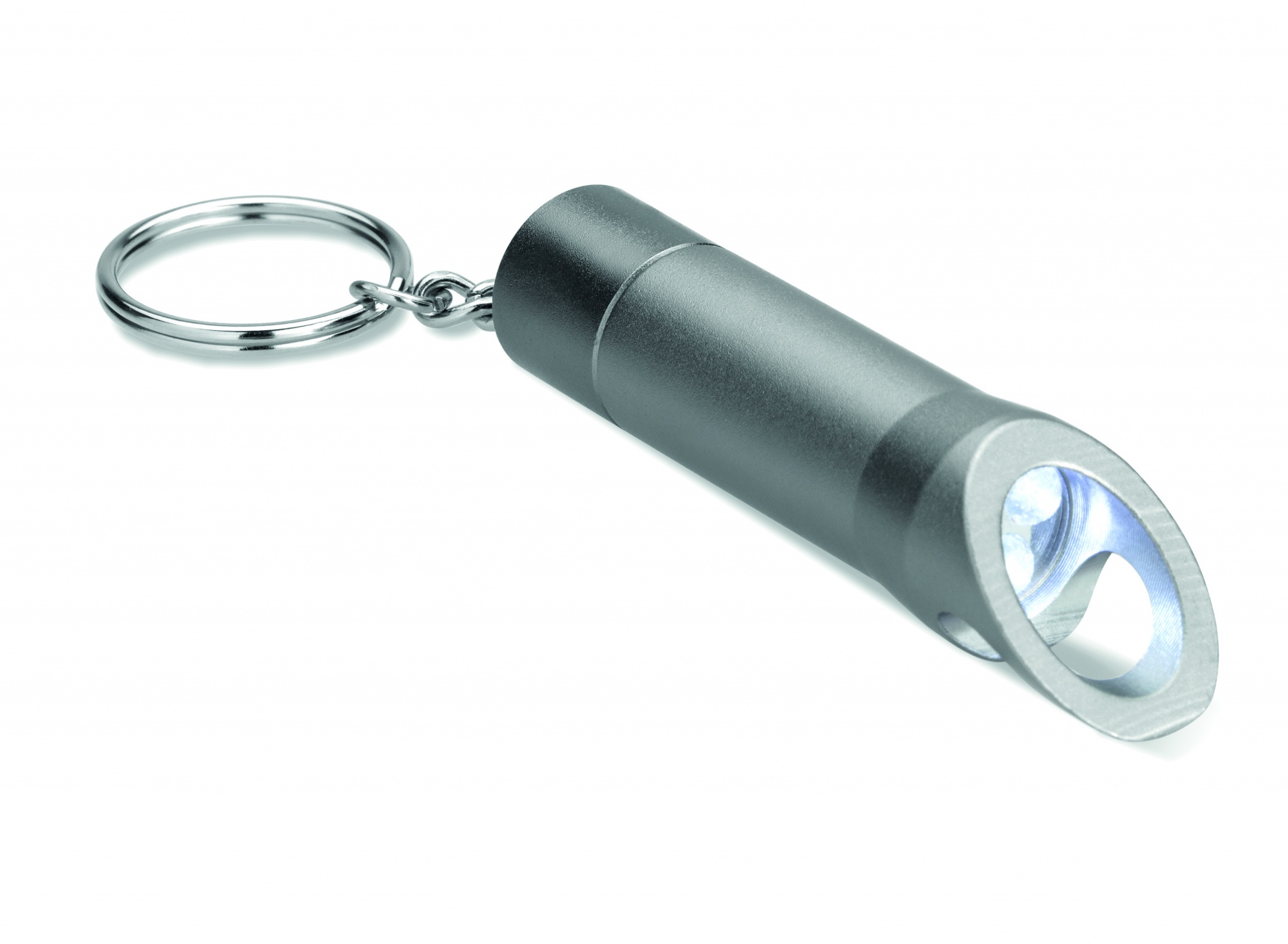 Metal LED torch key ring with bottle opener. 3 cell batteries included.