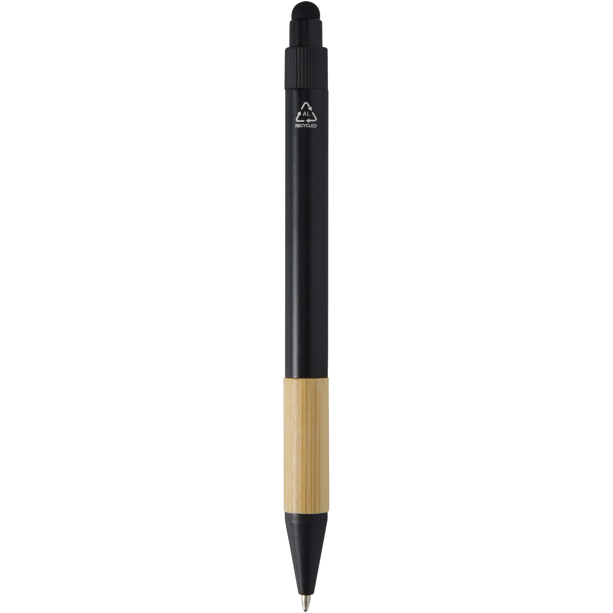 The Minka gift set includes a ballpoint pen made from RCS certified recycled aluminium with a stylish bamboo grip and stylus tip, an aluminium keychain (5.5 × 1.8 × 1 cm) with bamboo details and an integrated phone holder, and an RFID card holder (9.7 × 6.2 × 1 cm) with an aluminium alloy body and bamboo details, providing protection for up to 10 cards. The pen contains black ink with a writing length of 1000 metres. A thoughtful and practical gift that combines functionality with modern design. Supplied in a premium black gift box (16 × 16 × 2.7 cm) with a plain front, ideal for adding a logo.