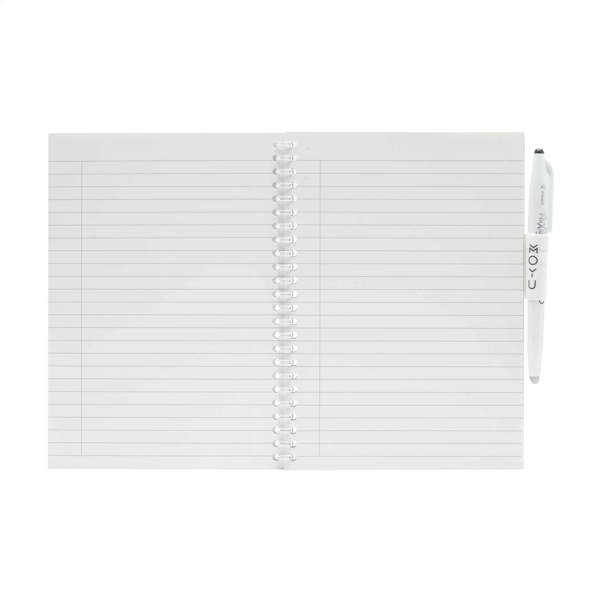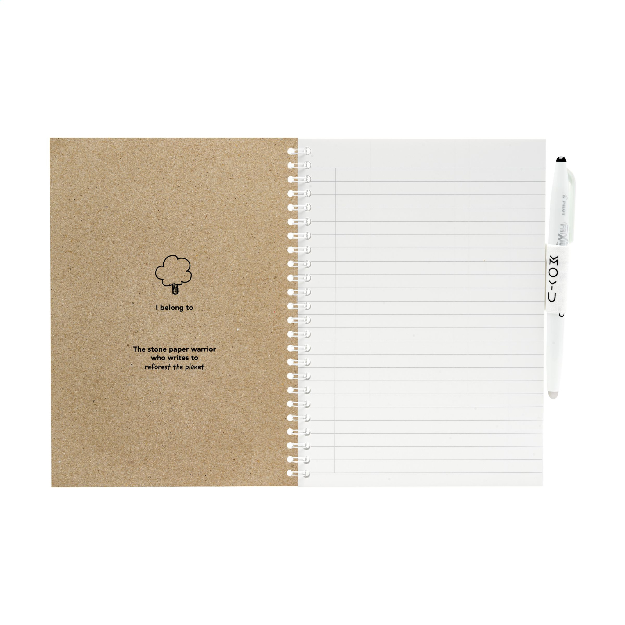 MOYU branded A5 erasable notebook made from stone paper. The sturdy cover is made from 440 grams of recycled kraft cardboard. This notebook includes a pen and cleaning cloth. Each stone paper page is sustainably produced, naturally tree-free and 100% recyclable. This notebook, with an elastic pen loop, is bound in a strong wire-o binding and has 18 pages lined paper. Take down notes with the accompanying, special MOYU pen. This pen contains the original Frixion ink. This special ink dries completely on stone paper and is easy to erase without leaving a trace. Slightly moisten the supplied MOYU cloth with some water and erase the ink. This way, pages remain empty for new ideas and to-do lists. You can write on rock paper 500 times on average. This notebook will last you for years. Stone paper is made from 80% limestone and 20% clean plastic. It is naturally tree free, and no water or chemicals are required to make it. The production of stone paper is therefore more economical and produces 67% less CO2 than in the production of pulp paper. In addition, stone paper can be recycled endlessly, without having to add new raw materials.