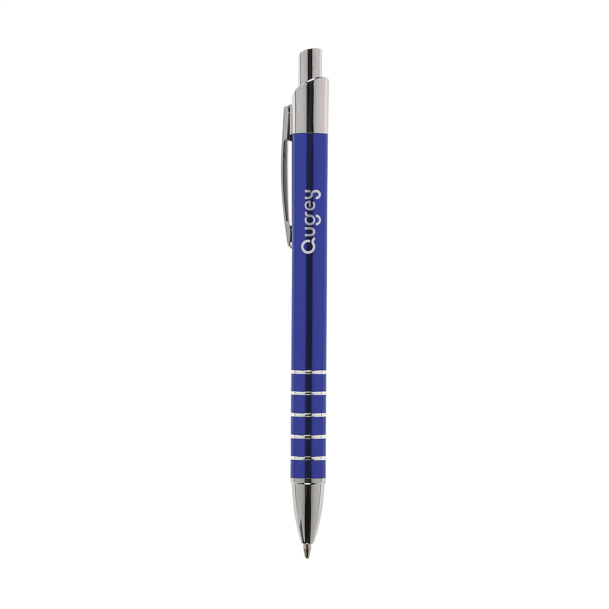 Blue ink, aluminium ballpoint pen in metallic look, with metal clip and trims.