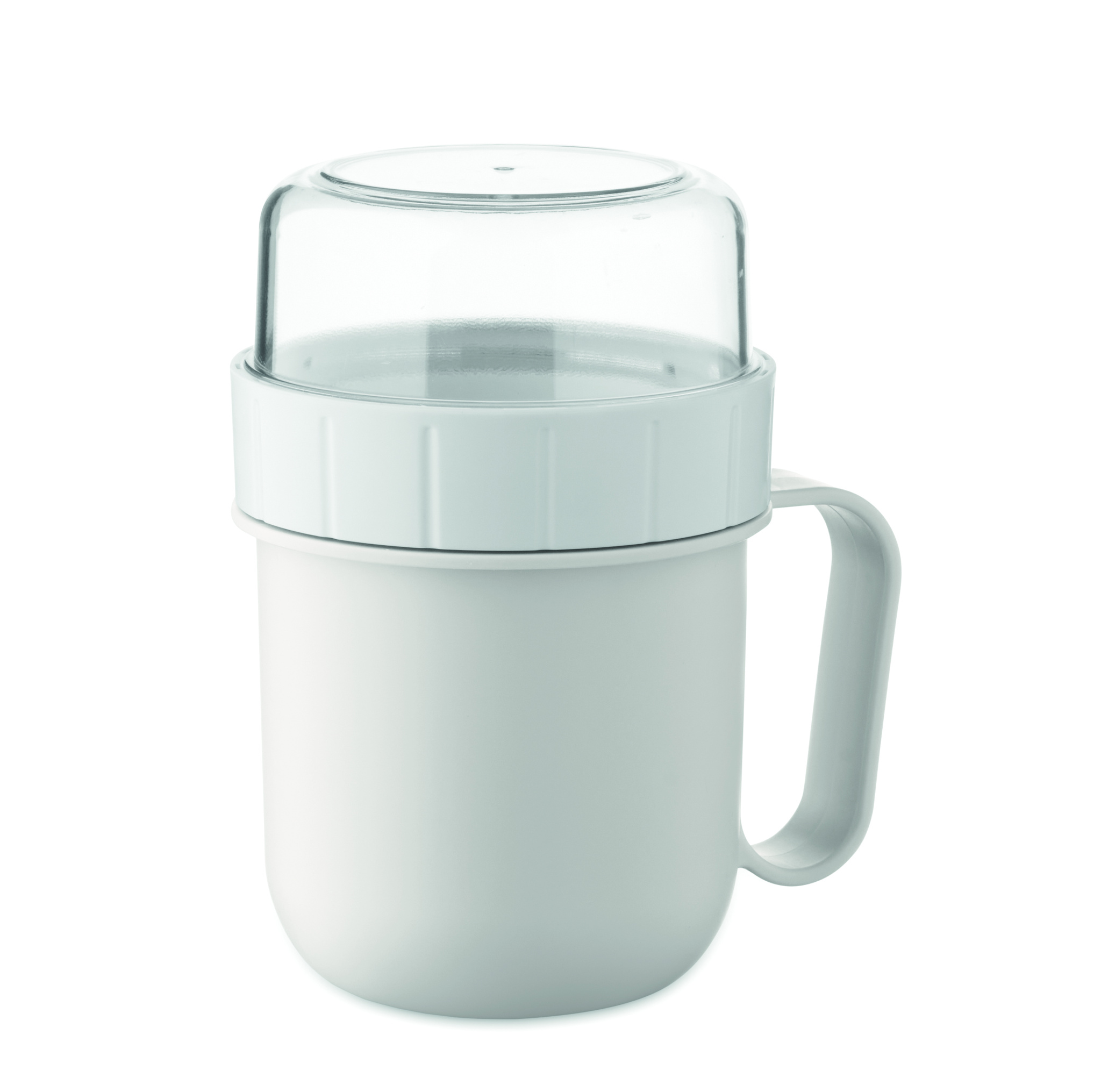Breakfast or brunch on the go cup in PP and PS lid container. Consists of 2 individual containers to keep ingredients separate. Capacity: 450 ml and 160 ml. Leak-free.