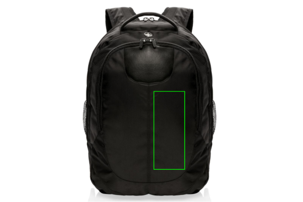1680D polyester laptop backpack with unique balance between comfort and outdoor protection. The backpack has pockets for all your necessities from padded laptop compartment and iPad holder, to pen loops and mesh pockets. On the shoulder strap there is an audio jack to connect your headphone and a sunglasses carrier. It even has a rain cover to protect it all. Registered®