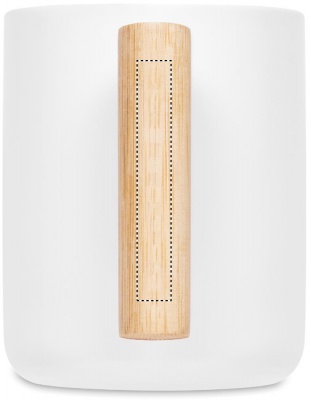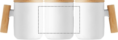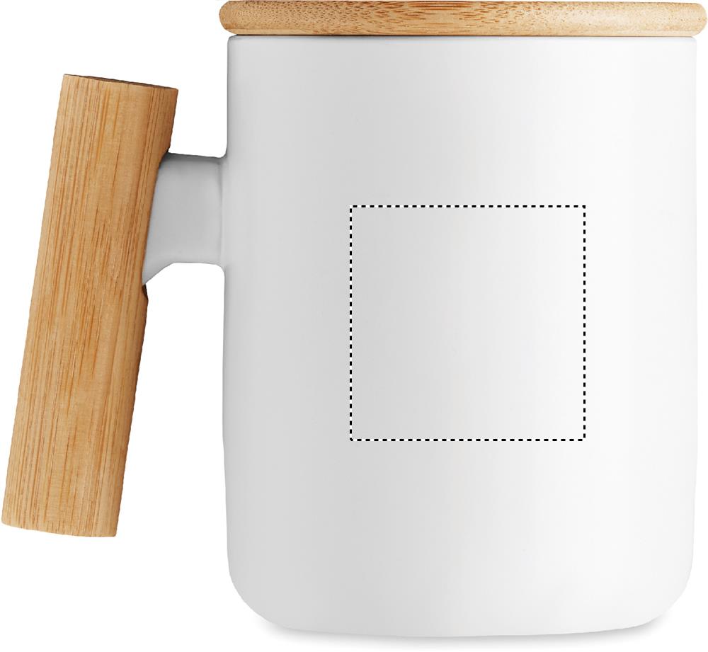 Porcelain mug with bamboo lid and handle. Capacity: 380 ml. Bamboo is a natural product, there may be slight variations in colour and size per item, which can affect the final decoration outcome.
