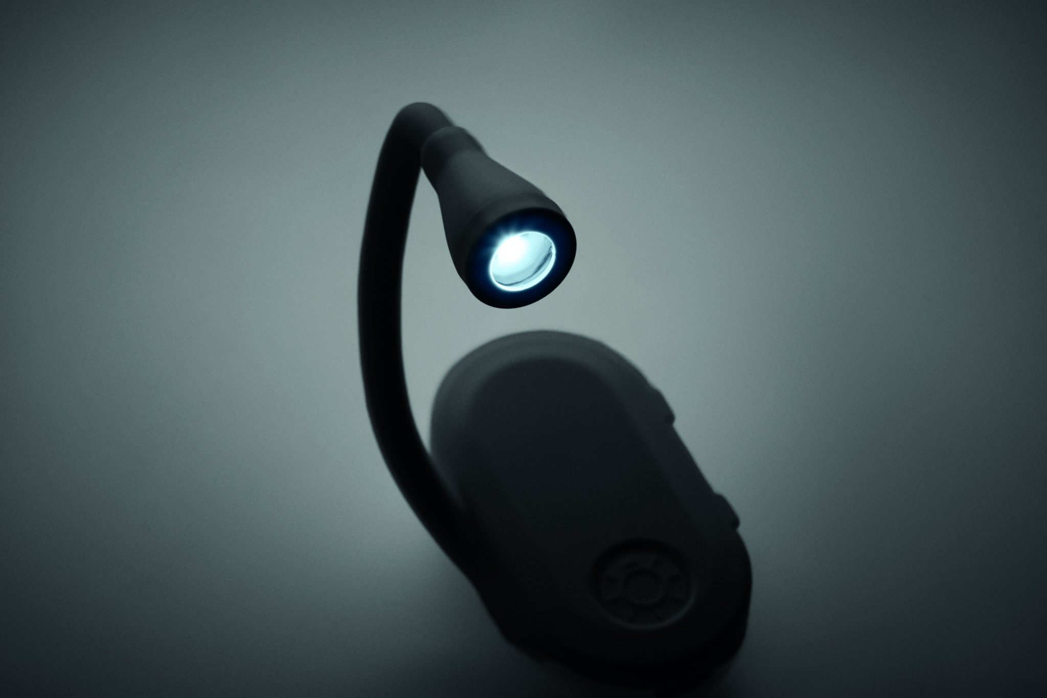 Rechargeable LED book light in ABS with flexible body and clip. Features 3 light settings, 300mAh battery.
