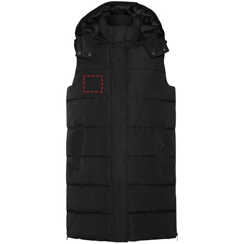 Padded bodywarmer with removable hood. High collar. Front zip closure hidden by flap. Two pockets with snap button closure. Side openings with zippers. Interior chest access. Water repellent.