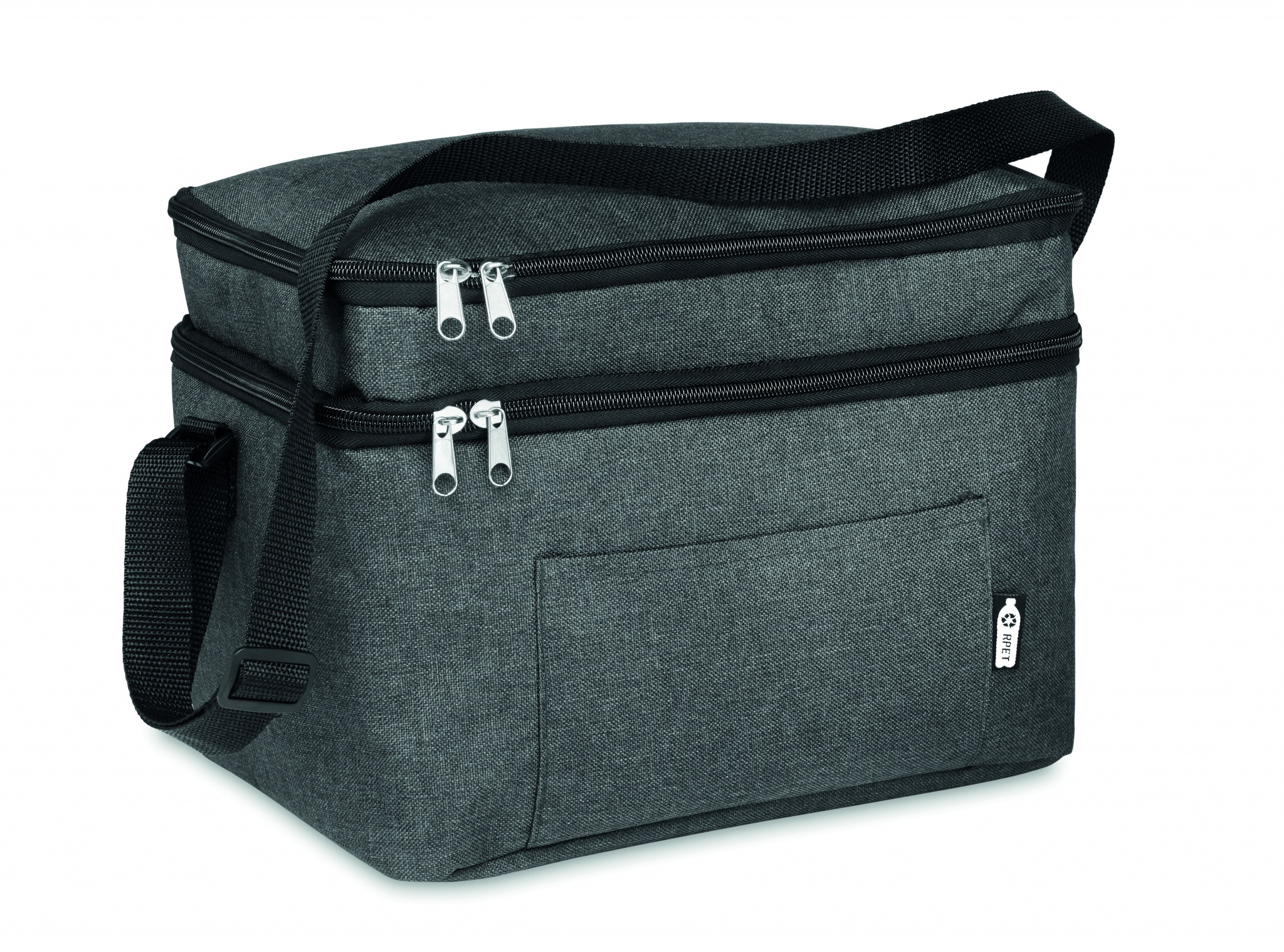 2 tone 600D RPET cooler bag with 2 compartments and PEVA lining. Adjustable shoulder strap and front pocket. Isolation material: 0.15mm PEVA + 3mm foam.