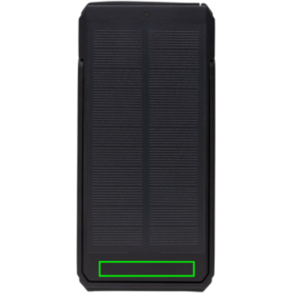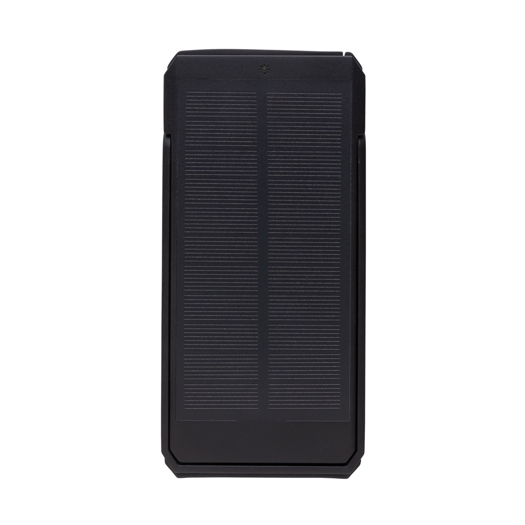 10.000 mAh solar powerbank made with RCS certified recycled ABS. Total recycled content: 18% based on total item weight. RCS certification ensures a completely certified supply chain of the recycled materials. The powerbank uses high quality monocrystalline solar panels with 19% conversion rate. Charge rate depends on conditions. With integrated stand function to use the solar panels at an optimal angle. The powerbank contains a long lasting grade A 10.000 mAh lithium battery. Charging speed solar: 5V/200mA. Input type C: 5V/2A. Output: USB A: 5V/2A Type C: 5V/2A. Item and accessories PVC free. Including RCS certified recycled TPE charging cable. Packed in FSC® mix packaging. Registered design®