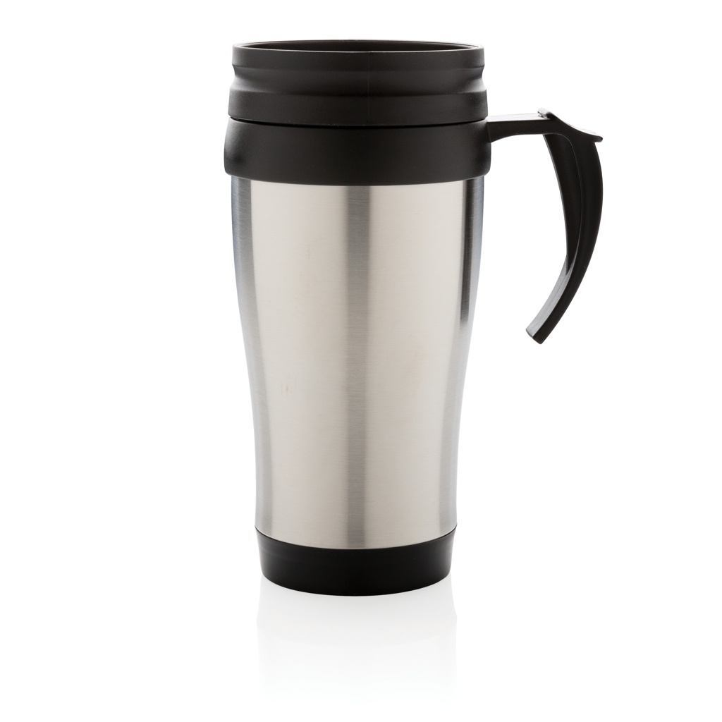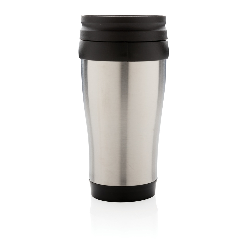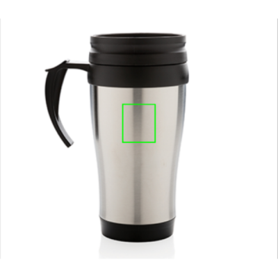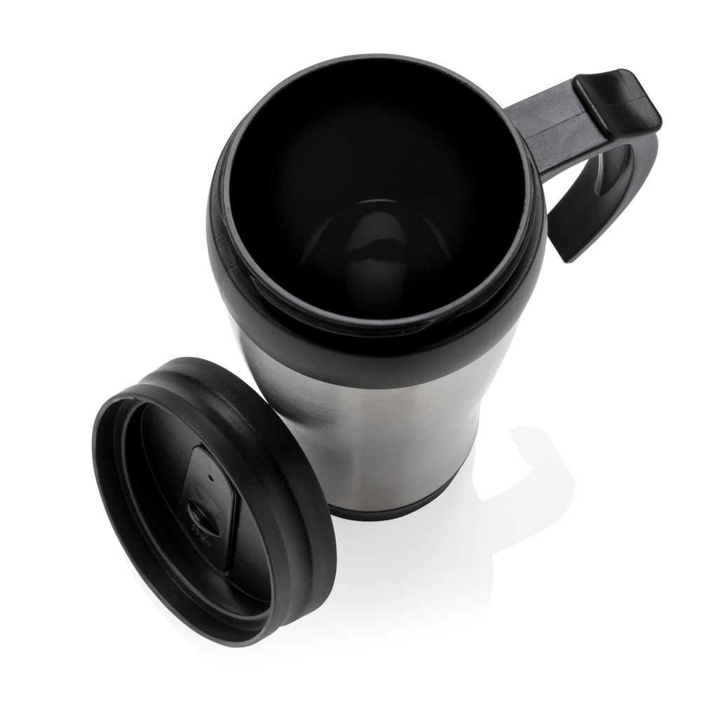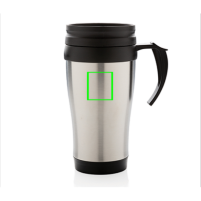 350ml stainless steel outside and PP inside mug with lid and base in black.